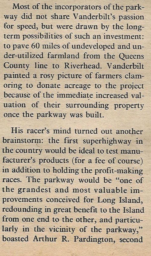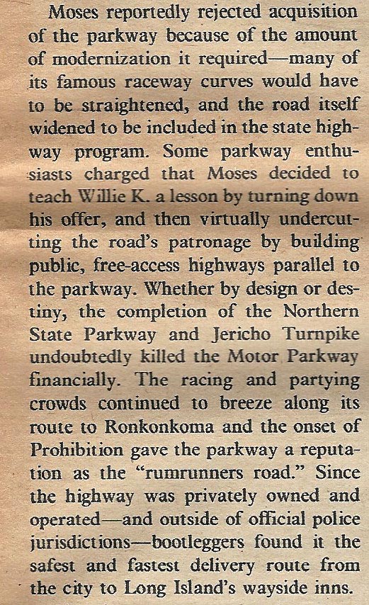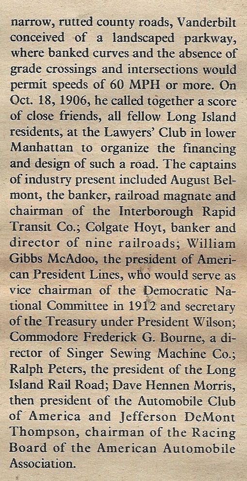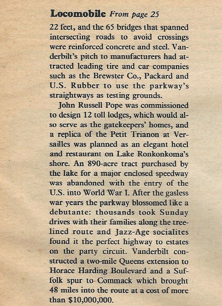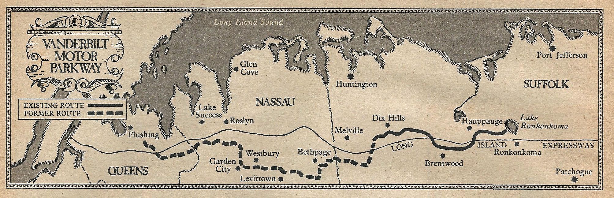 Note: While the article refers to the road as the Vanderbilt Motor Parway, the ccorrect name was always the Long Island Motor Parkway.