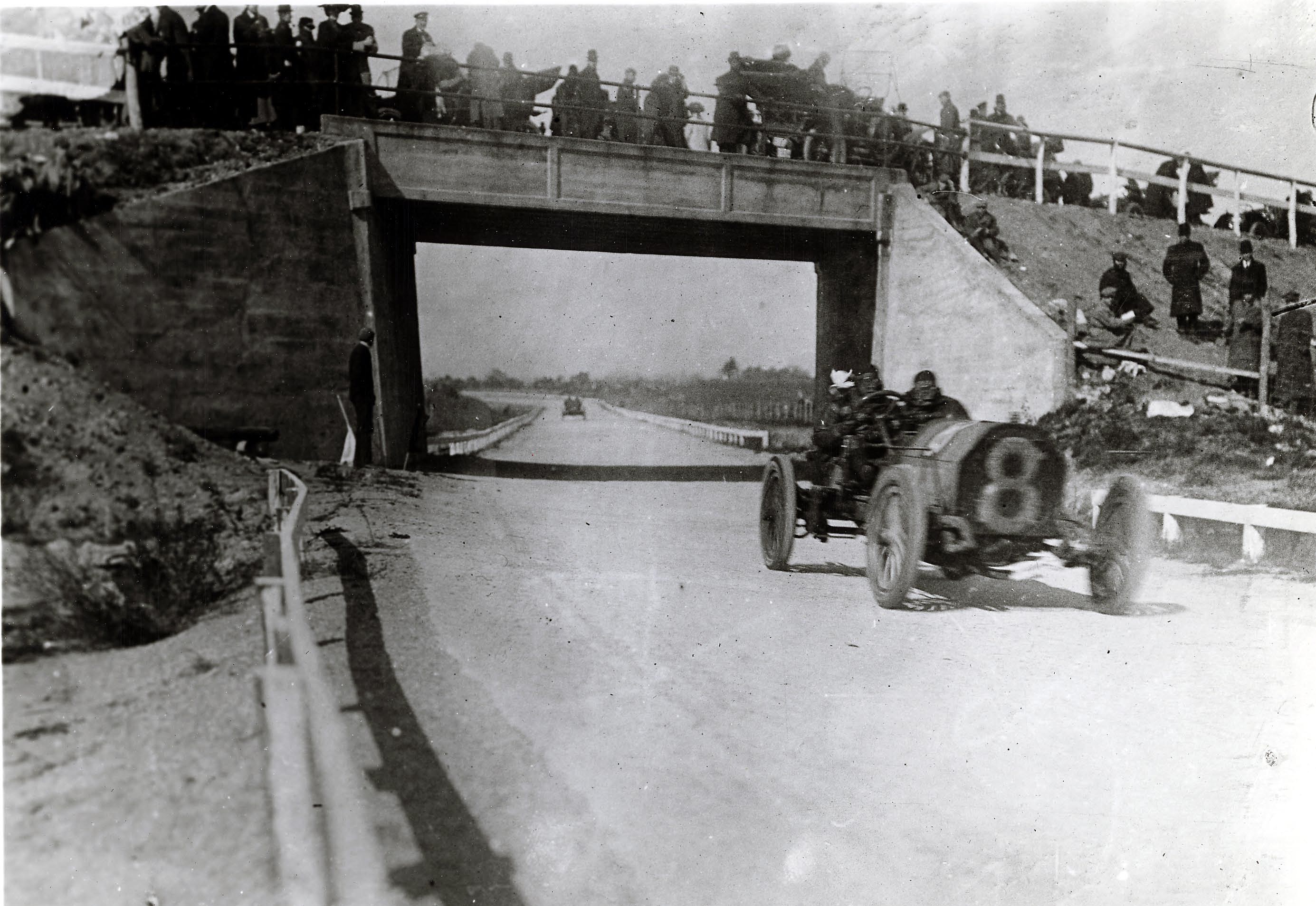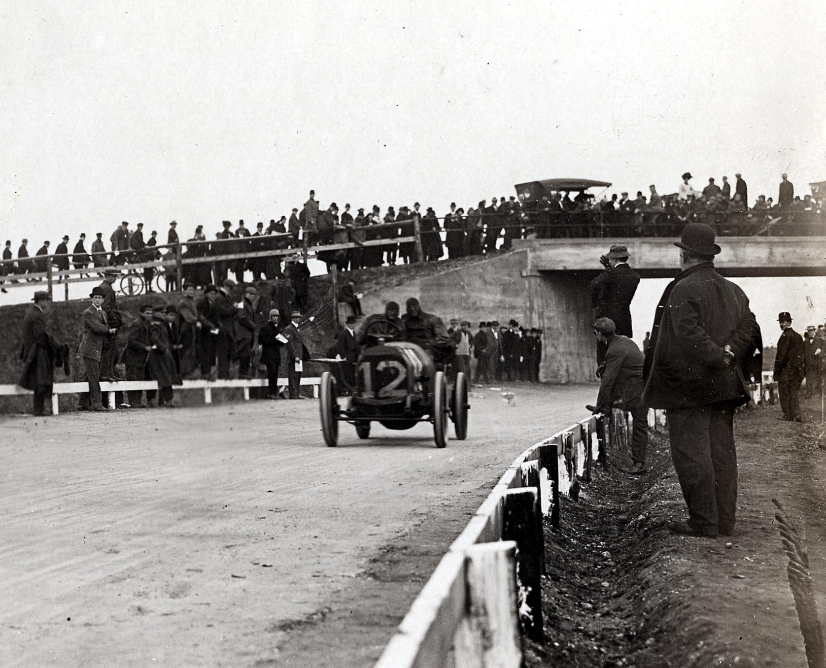 A crowd of spectators on the bridge had a wonderful view of Emil Stricker's Merecedes during the 1908 Vanderbilt Cup Race. Also note the parked cars.