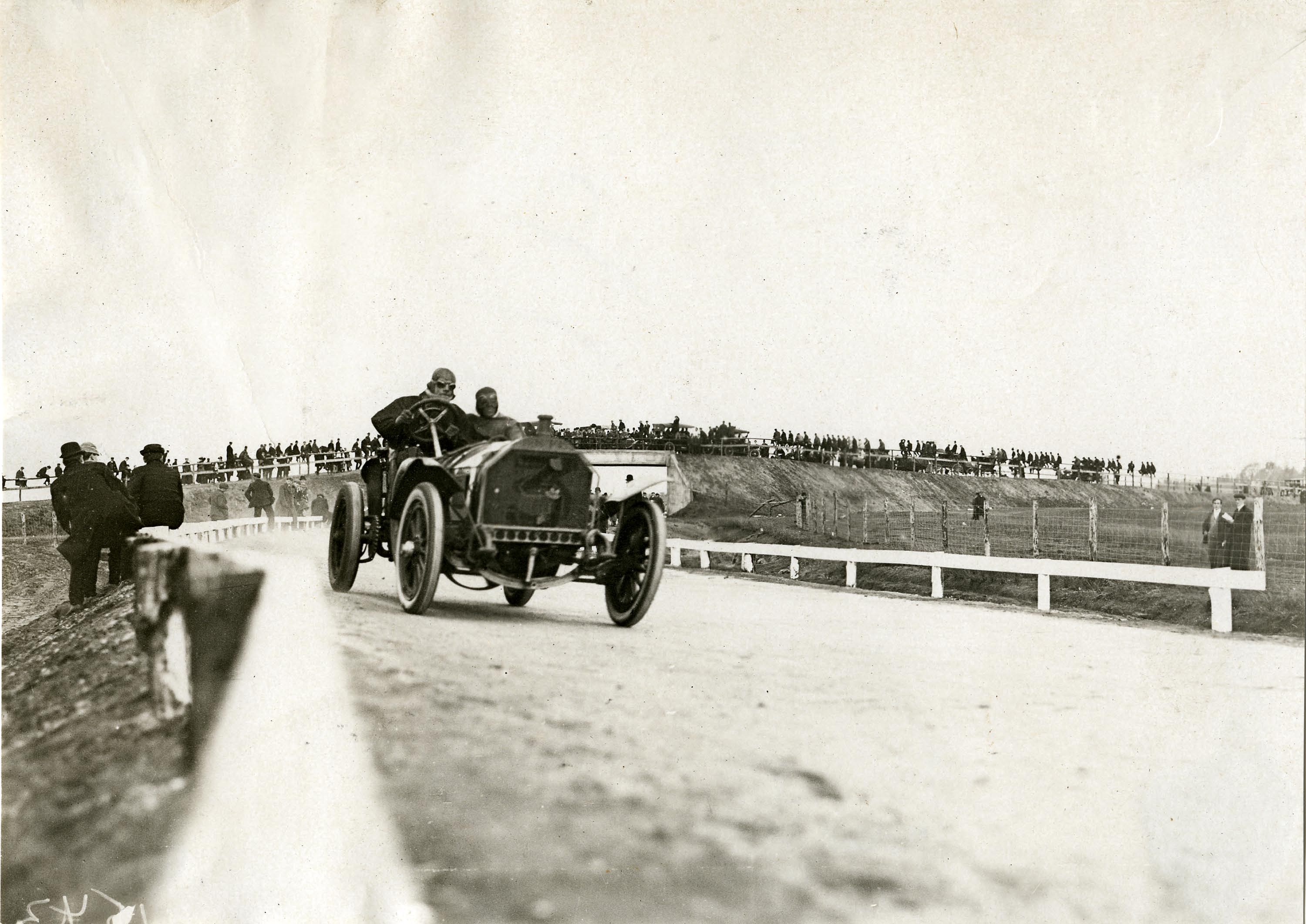 A close-up of Al Denison's Knox during the 1908 Vanderbilt Cup Race.