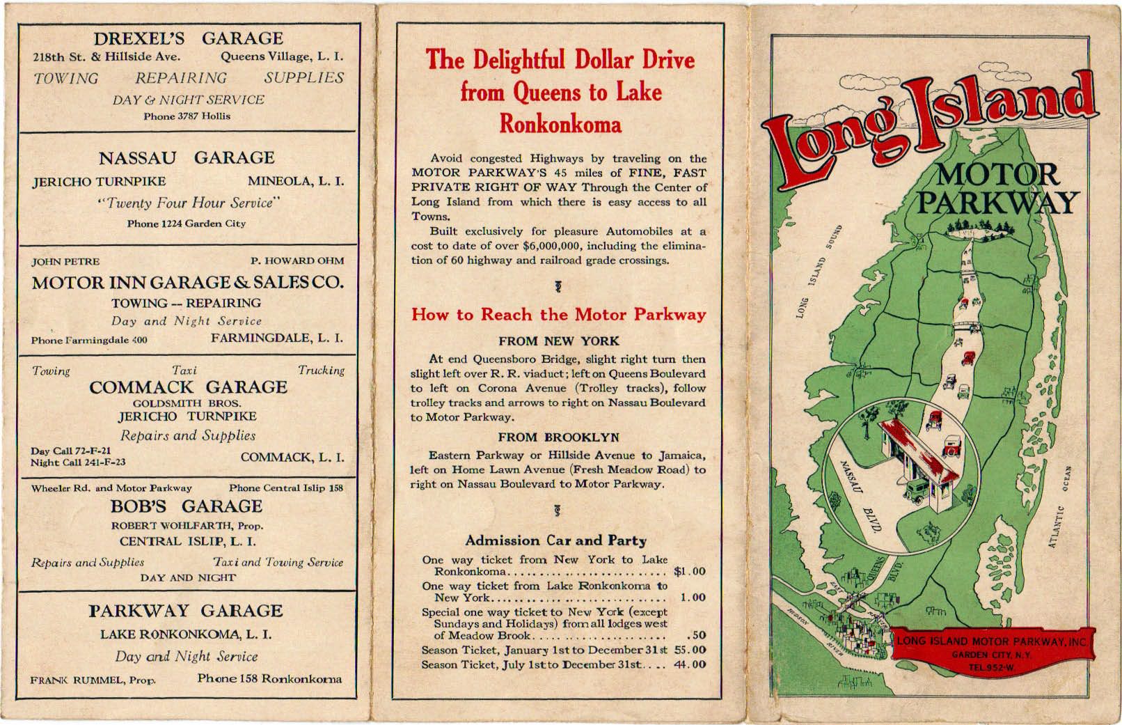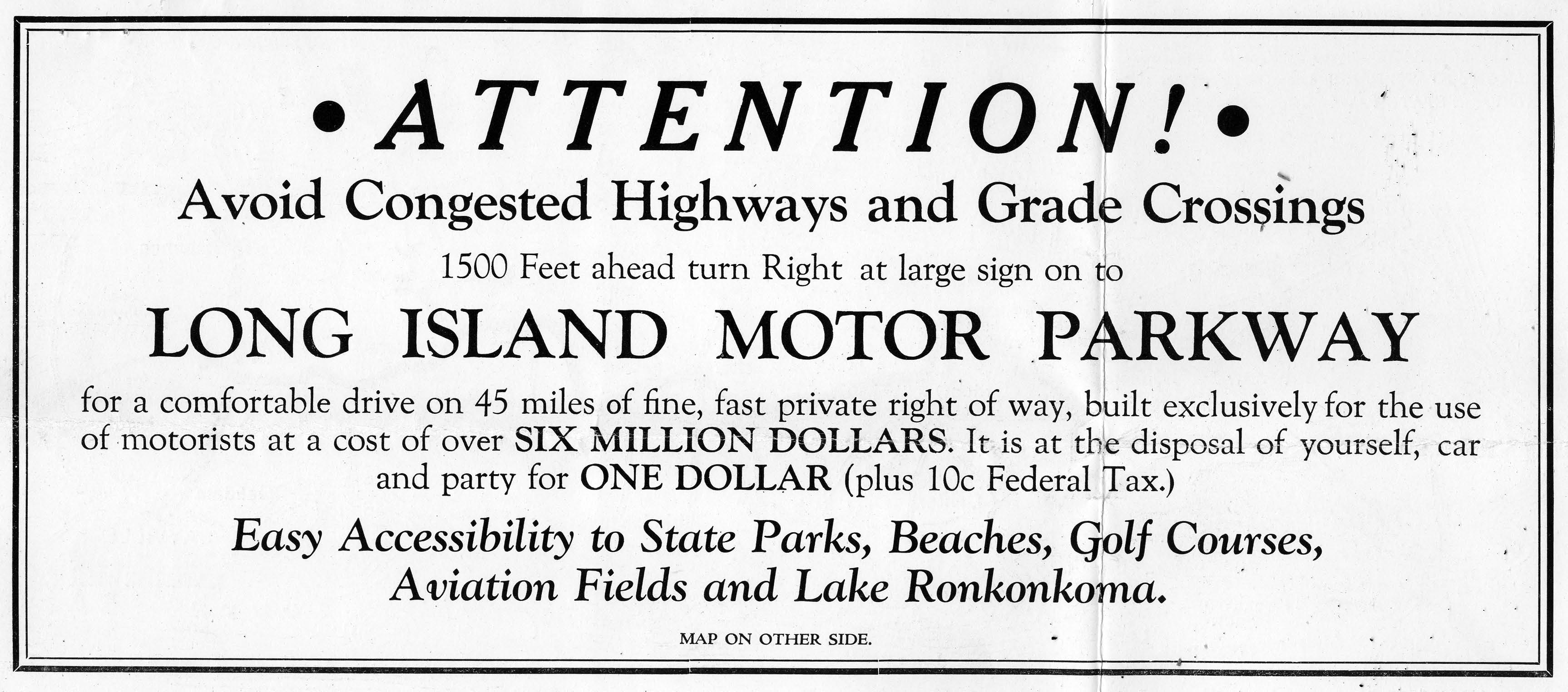 A Motor Parkway brochure/map noted "a comfortable drive on 45 miles of fine, fast private right of way, built exclusively for the use of motorists at a cost of over six million dollars."
