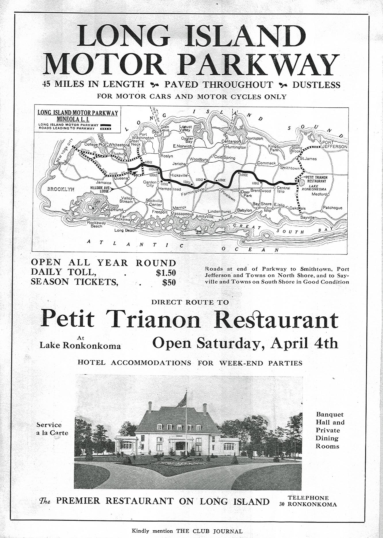 This Petit Trianon and Motor Parkway flyer claimed "45 miles in length, paved throughout and dustless."