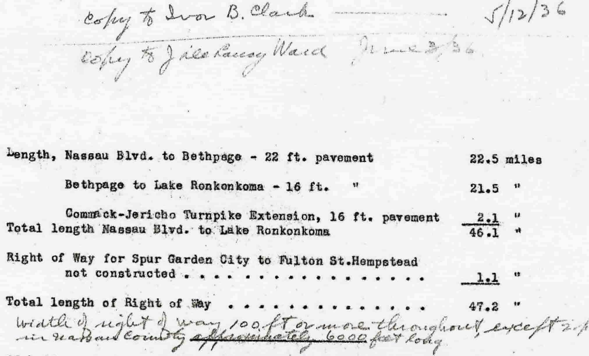 ...And, finally, the best source reference; A1936 memo from the Long Island Motor Parkway, Inc. The length of the road was 44.0 miles plus 2.1 miles of the Commack-Jericho Turnpike Extension.