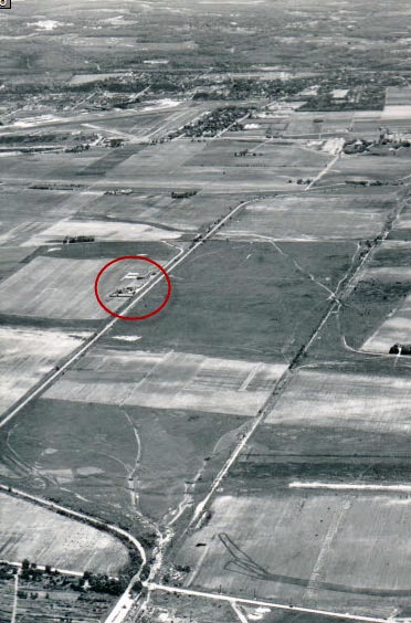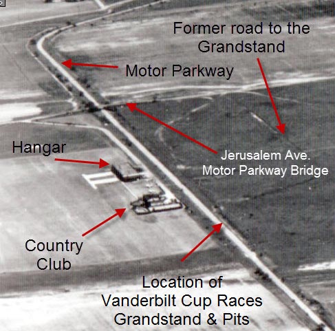 This early 1930s aerial looking east shows the Long Island Aviation Country Club (left in the middle) and its relationship to the Motor Parkway. The Jerusalem Avenue Motor Parkway Bridge can be seen just east of the club.