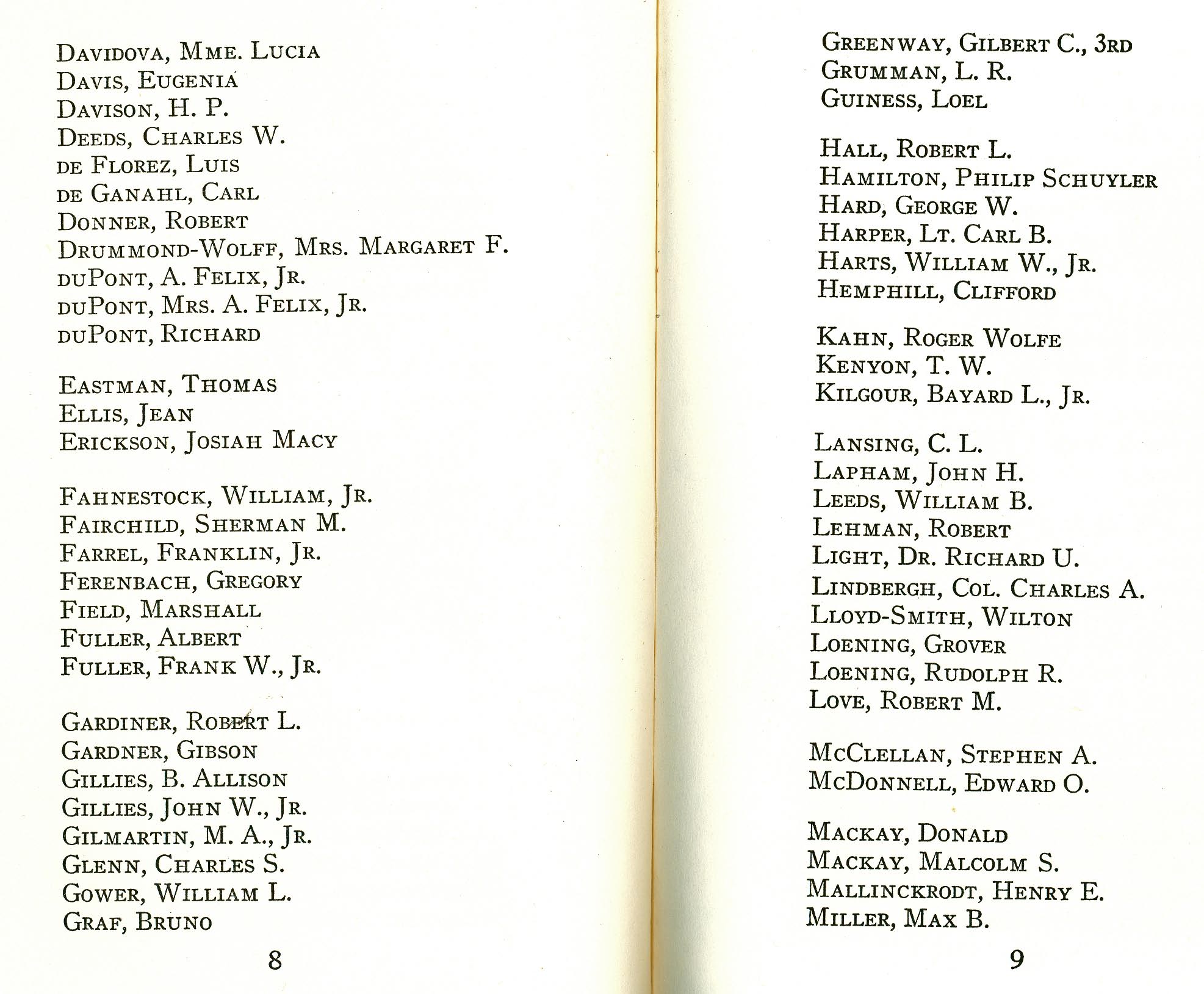 Members of the club including the flying elite of Long Island. Their 1940 club membership book listed; Col. Charles Lindbergh, Sherman Fairchild, L.R. (Leroy Randle) Grumman and several DuPonts. As described in the biography: Anne Morrow Lindbergh: Between the Sea and Stars, Charles Lindbergh taught his wife how to fly at the Long Island Aviation Country Club