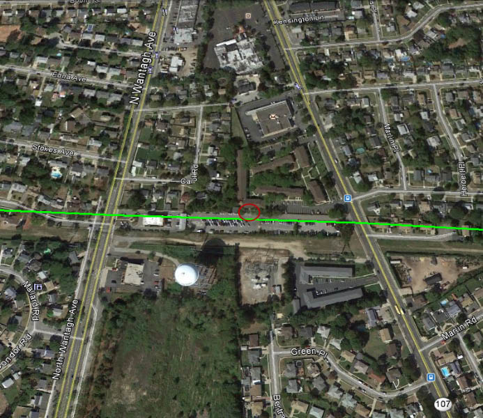 This a view looking east from the Wantagh Avenue Bridge. The lodge is in the background on the right. The Central branch of the LIRR is parallel to the Motor Parkway on the right.