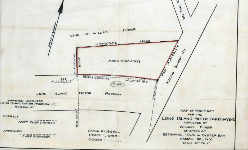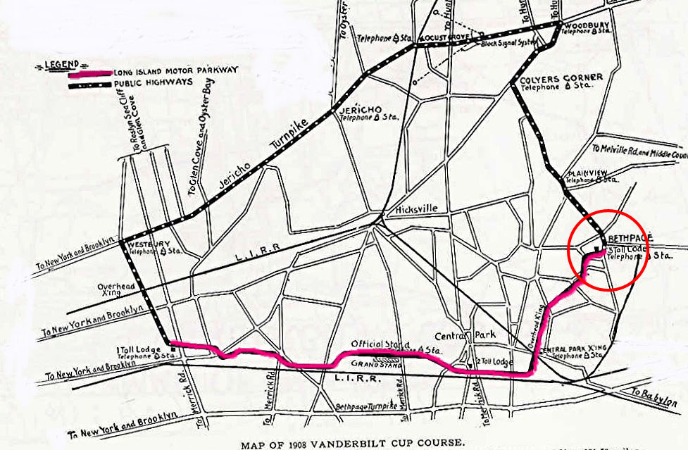 The 1908 eastern terminus of the Motor Parkway was located just east of the lodge at Round Swamp Road. As seen in this map, it was part of the course for the 1908 Vanderbilt Cup Race, the only time the races passed through this section. The 1909 and 1910 courses for the Vanderbilt Cup Races were shortened and ended at Massapequa-Hicksville Road.