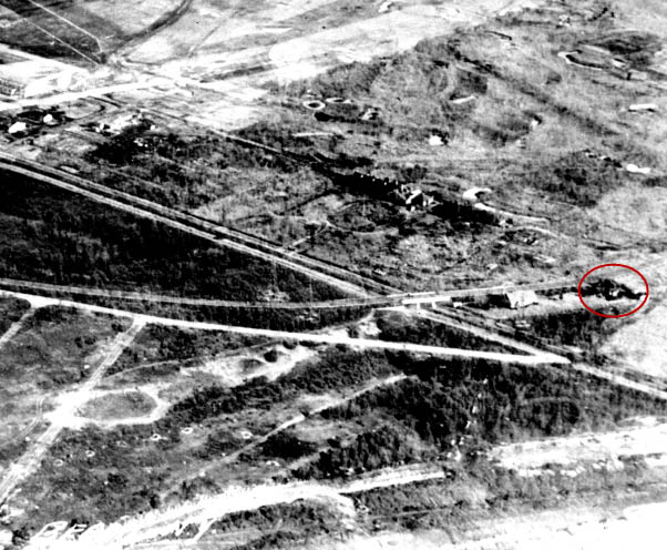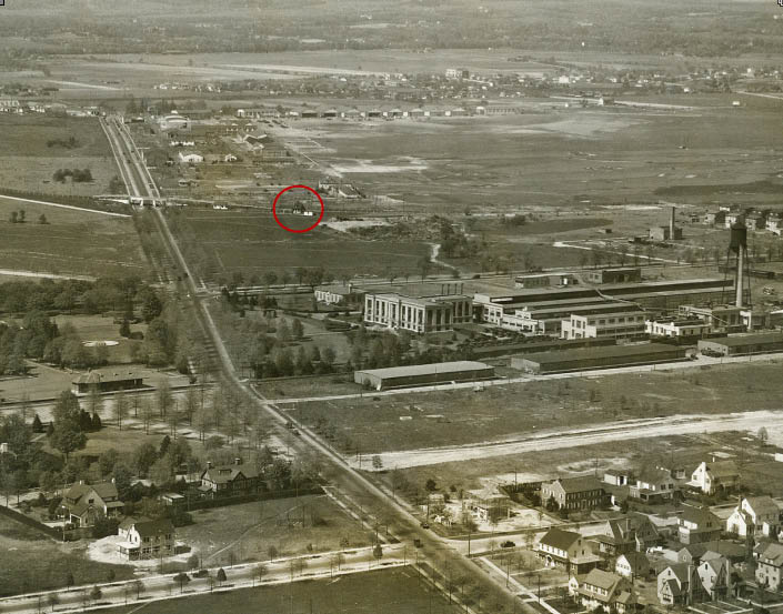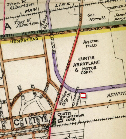 The 1927 aerial looking north showing the relationship among the Garden City Lodge, Clinton Road, Stewart Avenue, Curtiss Engineering Company and Curtiss Field.