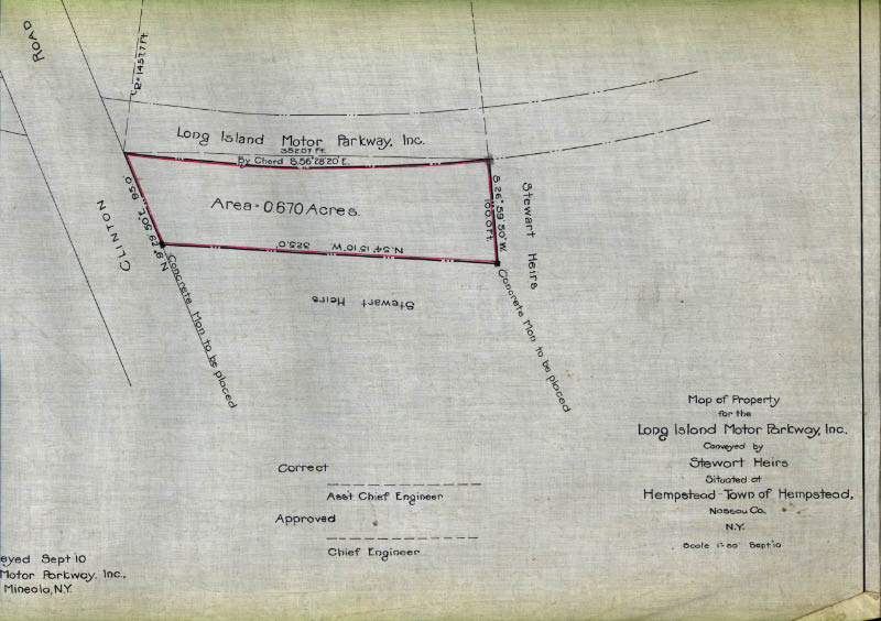 The 0.670 acres for the Garden City Lodge and the General Manager's Office were obtained by the Motor Parkwayfrom the heirs of Irish entrepreneur Alexander Tunney (A.T.) Stewart.