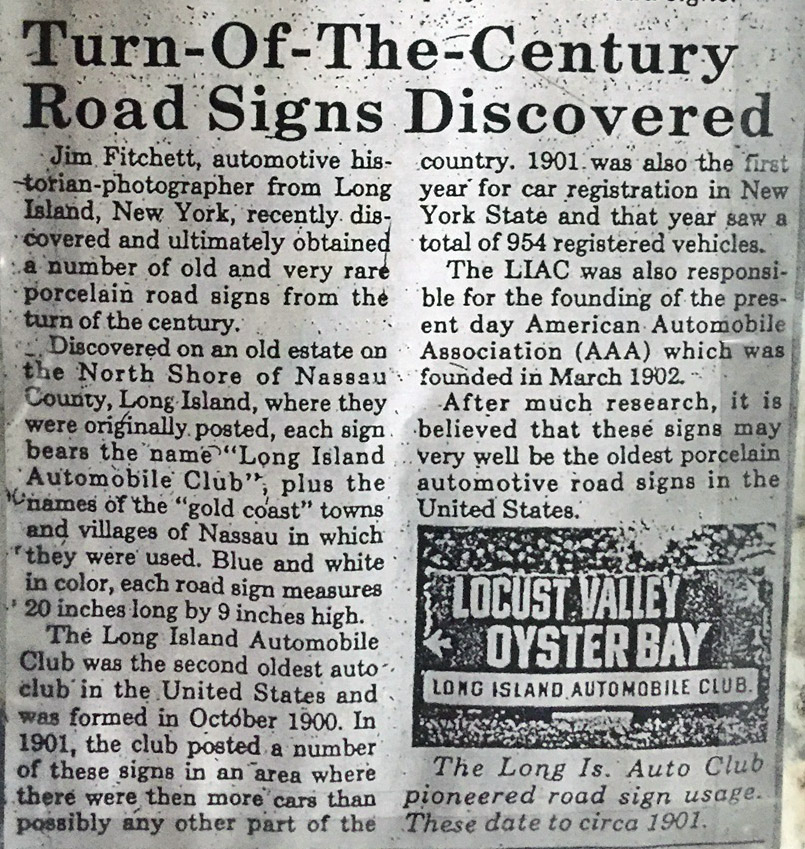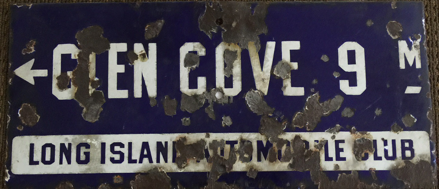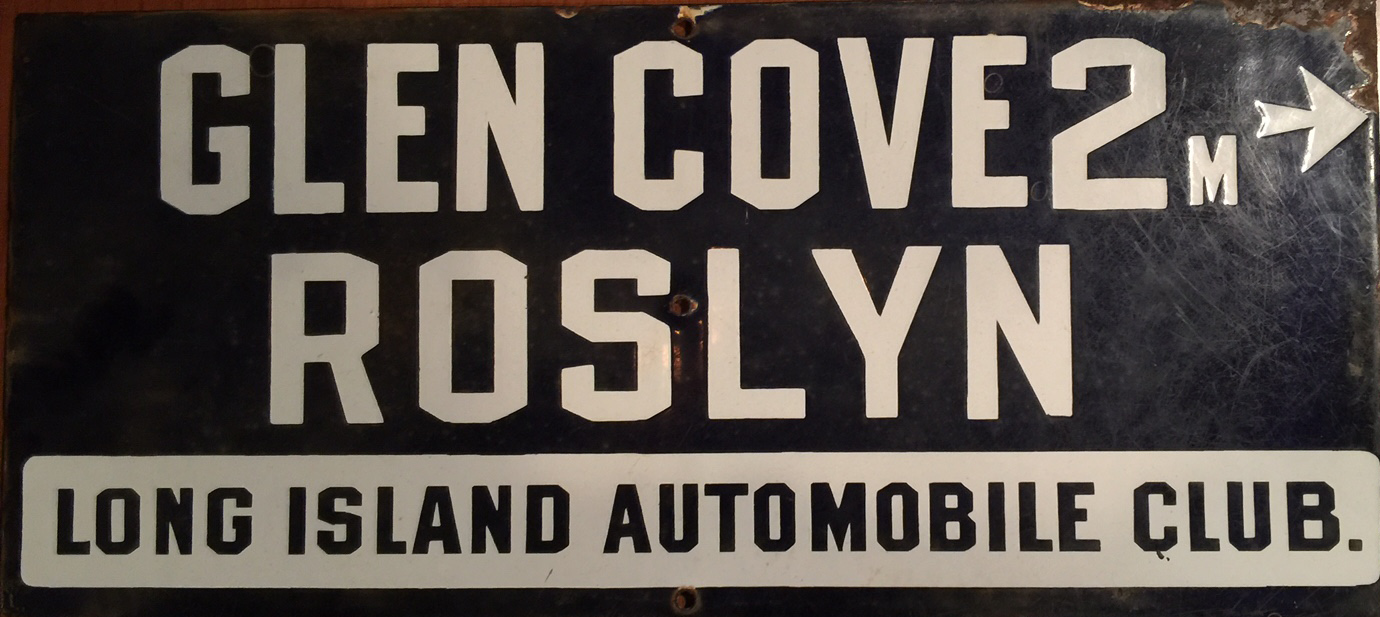 Just months after being founded in October 1900, the Long Island Automobile Club posted 20" x9" porcelain road signs on the major Long Island roads. Each blue and white sign included the club's name and directions to the nearest village(s).