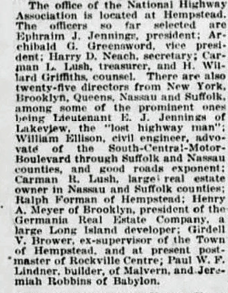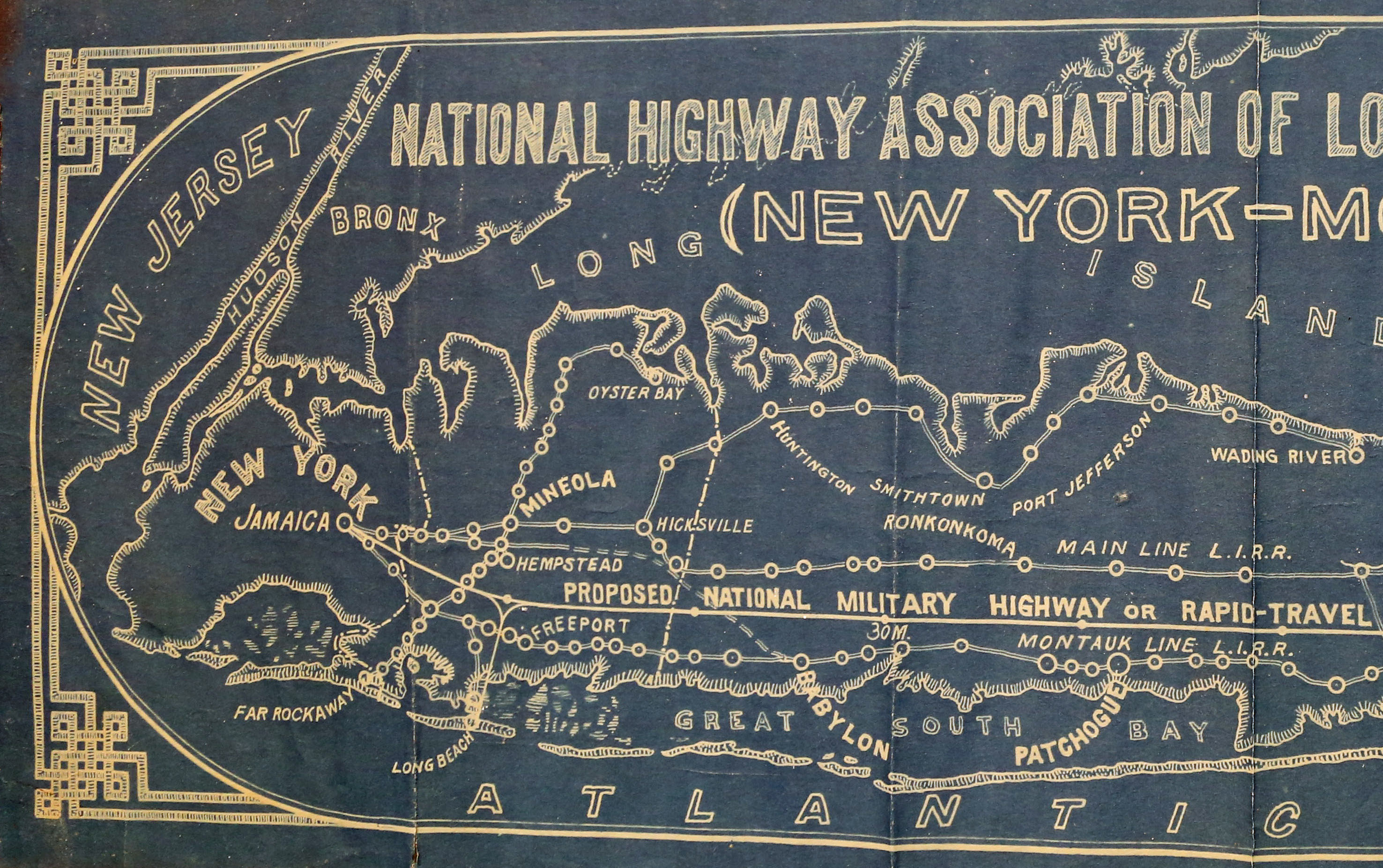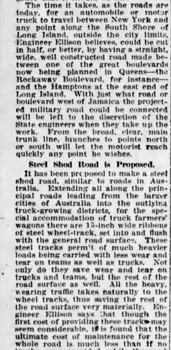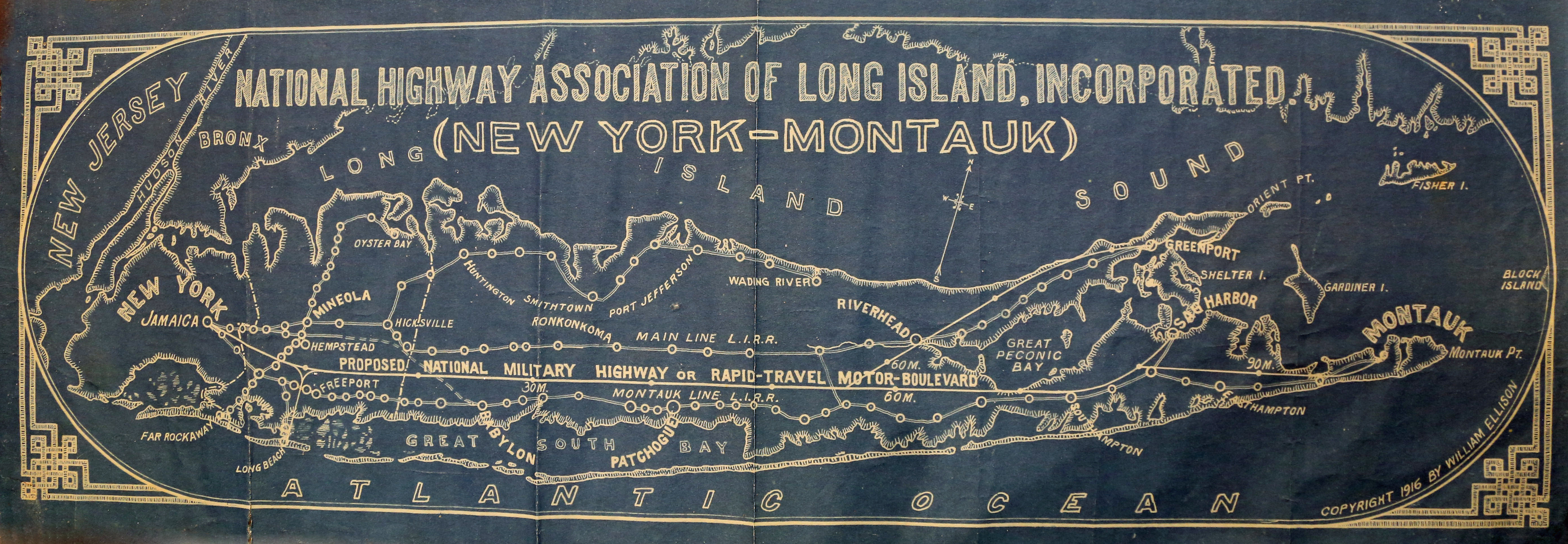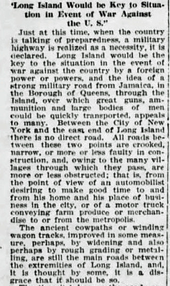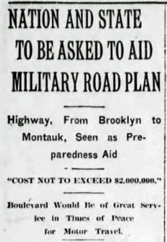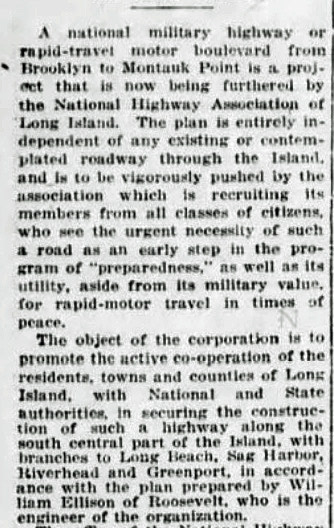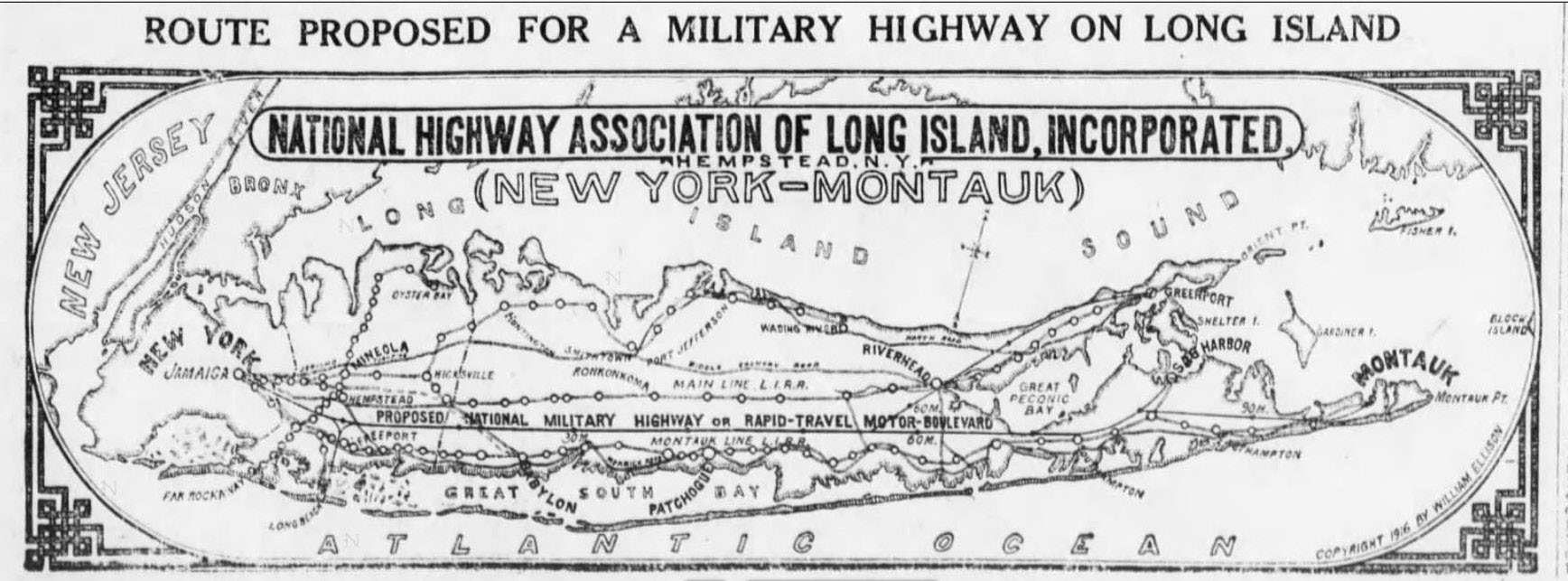 Established by Charles Henry Davis in 1912, the leading advocate for the development of national highways and "good roads everywhere" was the National Highways Association. With war raging in Europe, in 1916 the National Highway Association of Long Island proposed this 90-mile national military highway from Jamaica, Queens to Montauk.