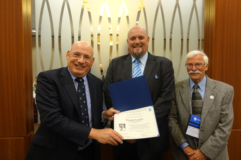 Howard Kroplick (left) receiving the award from Devin Lander, New York State Historian (center) and John Scherer, Town Historian of Clifton and a chairperson of the APHNYS Awards Committee (right).