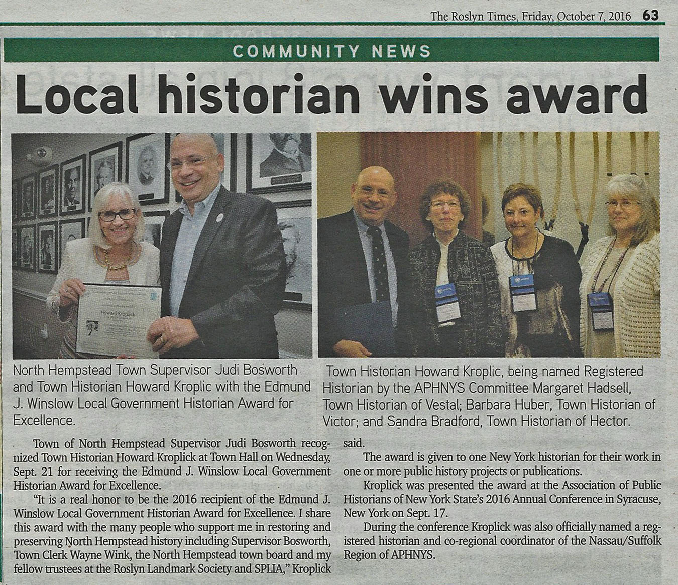 Today's issue of The Roslyn Times reported on the awarding of the 2016 Edmund J. Winslow Local Government Historian Award for Excellence at the September 17, 2016 meeting of the Association of Public Historians of New York State (APHNYS) in Syracuse, New York.