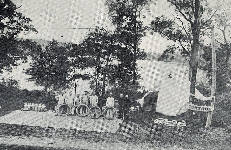 To meet this challenge, tire companies established service stations around the courses. Tire companies represented in the race were G&J, Diamond, Continental, Goodrich and Michelin. The adventure for all these crews extended well beyond the race. They lived at their stations, part of their duties to protect the supplies from theft or tampering.