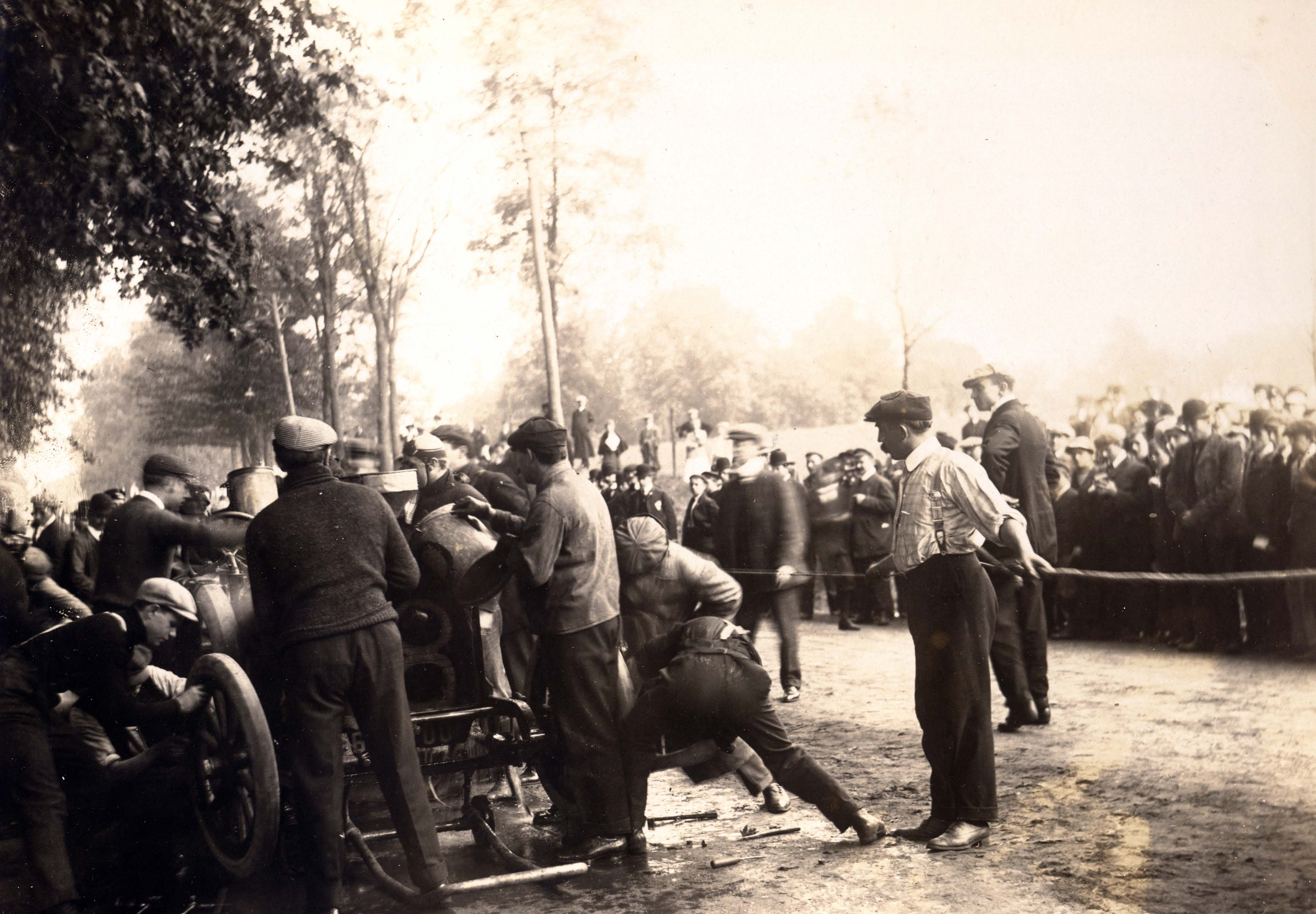 A wonderful image of a repair and repair station. As with most Vanderbilt Cup Race photos, every man and boy was wearing a cap, hat or derby.