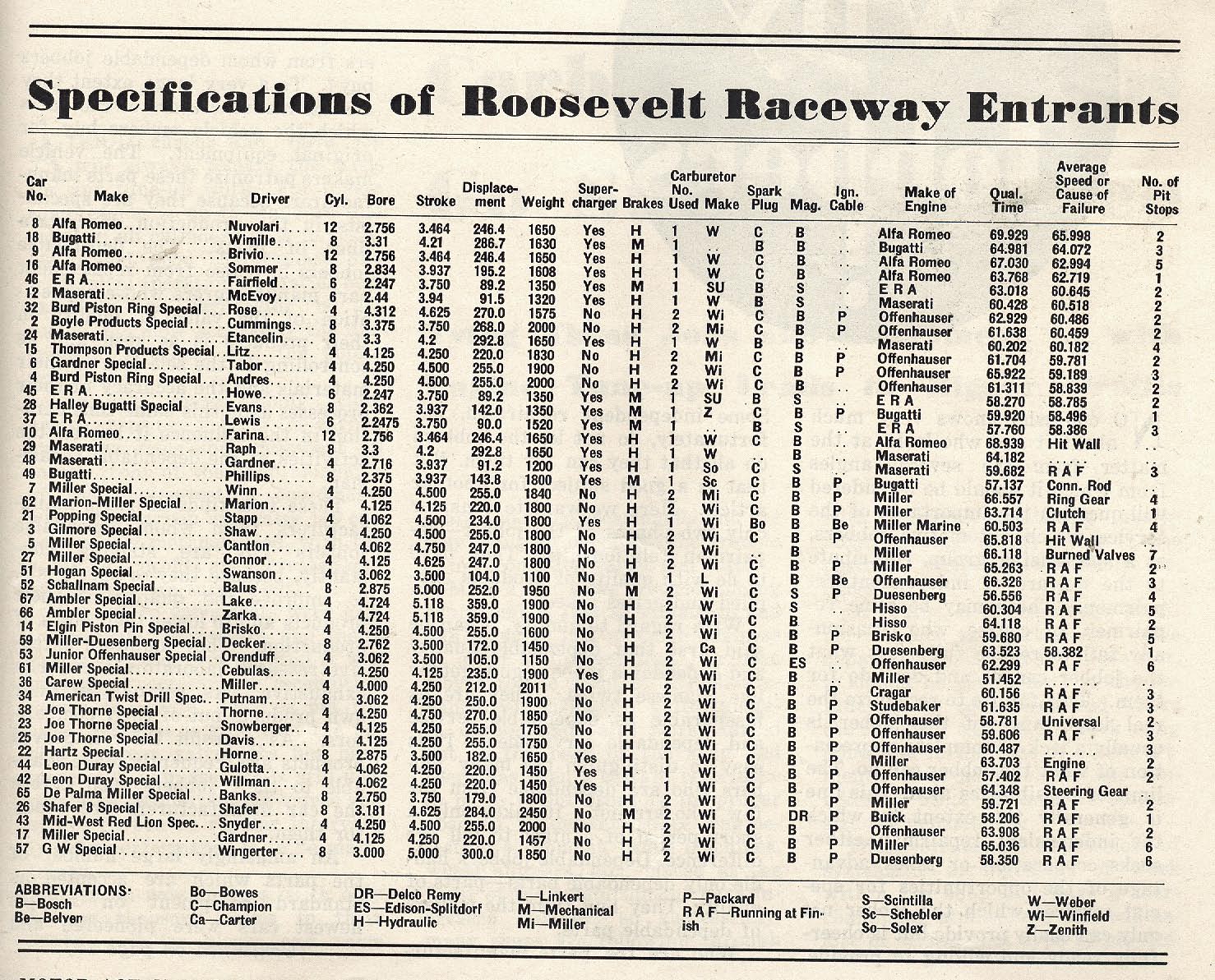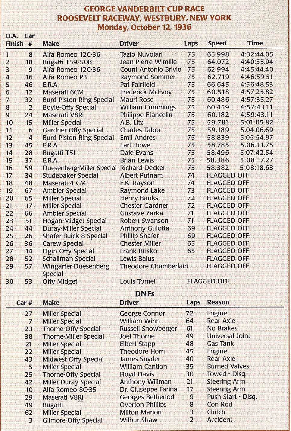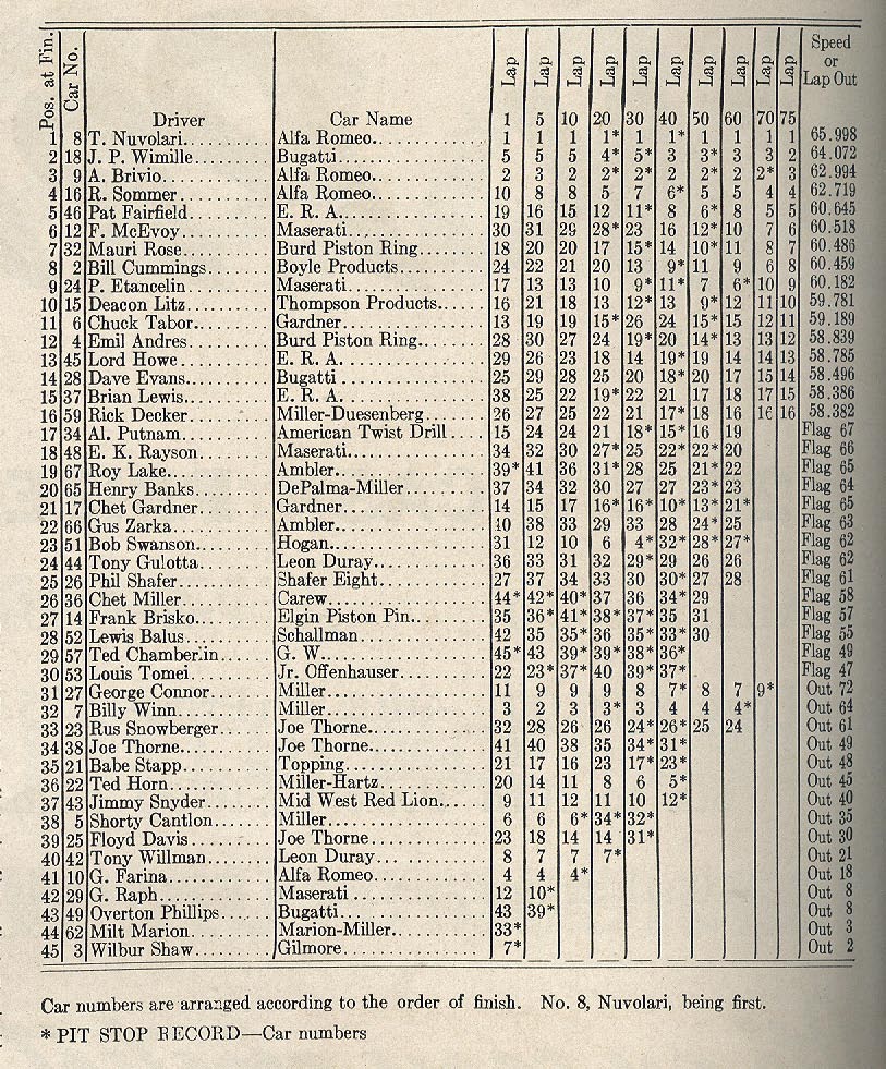 Finn's chart of the 1936 race results shows that Swanson's #51 Hogan Midget Special finished 23rd and Tomei's #53 Offy Midget finished 30th.