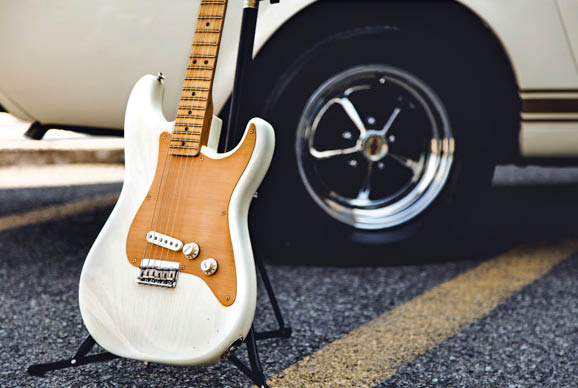 Car culture was beyond huge in the ‘60s, and the automobile mystique seemed to tie-in with everything, including guitars. It wouldn’t be long before the racing car motif found its way onto ’69 Fender Mustangs with competition “racing” stripes. Meanwhile, the off-white and gold mashup bridged the connection of cars and guitars when a very, very rare Fender Custom Shop guitar built specially for Reverend Billy Gibbons showed up at our door. We realized there was a Cars and Guitars hookup that had to happen.