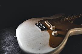 Of the 2,370 GT350s acquired by Shelby, 999 were specially modified for the Hertz Sports Car Club, which invited card-carrying Hertz car rental customers the privilege of driving a Shelby modified racing car, for $17 dollars a day and 17 cents per mile. “Business travelers who [Mustang Main (1 of 1)] want a change in pace in motoring, sports car owners away from home, vacationers who consider driving an enjoyable holiday sport,” read Hertz’s advertisement. You can tell that its 1966, and traffic wasn’t what it is now. The GT350 earned the “H” designation for the purpose of distinguishing it as a Hertz rental car. Another tell-tale indicator of this car—and any other Mustang, new or old, is the gold racing stripes throughout. The gold stripes specifically indicate that the car is a Hertz rental, along with the standard automatic transmission. Kroplick acquired the GT350H in 2004 at an auto auction, the first car in a collection that also includes the famed 1909 Alco Racer that we profiled in the Cars and Guitars: Beauty and the Beast article that we published as a blog in July, 2014. Vroom! Let’s now turn our attention to the guitar.