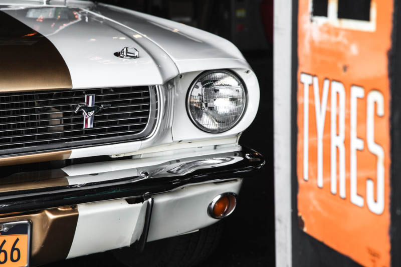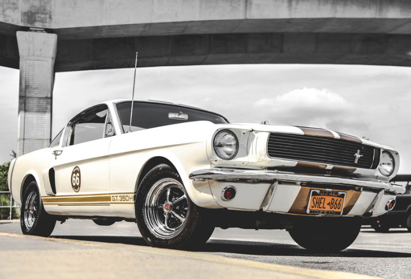 We’ll start with the car since it was here first. On first glance, the casual passerby might think, “Okay, a vintage Ford Mustang with racing stripes.” Howard’s car is actually a 1966 Shelby Mustang. Certainly, the GT350 began life in a Ford factory in San Jose, California before making its way to the garage of race car legend Carroll Shelby, whose Shelby American company would modify the cars with custom Magnum 500 wheels, disc brakes, a Cobra engine (water-cooled V8 with overhead valves and 306 hp at 6000 rpms), high-performance shocks, and a torque-controlled rear axle.