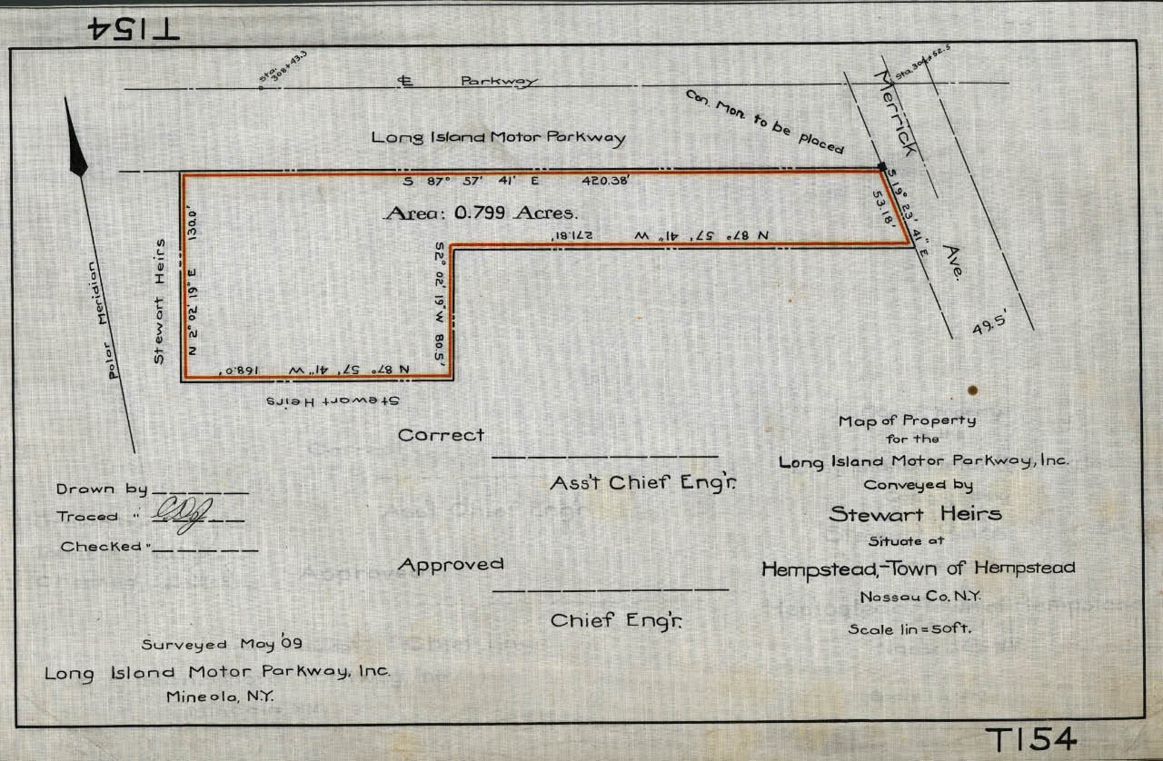 As shown in this 1908 survey, the Meadow Brook Lodge was located west of Merrick Avenue and north of Stewart Avenue in Westbury. The 0.799 acres were sold to the Motor Parkway by the heirs of A.T. Stewart.