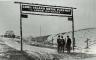 The entrance/exit ramp and sign to the Meadow Brook Lodge were located on the south side of the Long Island Motor Parkway and west of Merrick Avenue in East Meadow. The lodge can be seen in the distance, while the beginning of the parkway bridge over Merrick Avenue is to the right of the three men.