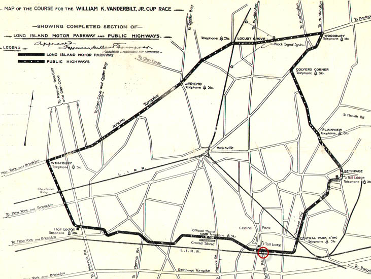 An eighth of a mile past the Wantagh Avenue Bridge, the drivers came to the eastern end of the Motor Parkway section of the course at the Massapequa Lodge. During the race, the racers transitioned from the concrete Motor Parkway onto a temporary crushed stone road just south of the lodge. The temporary banked road curved north to connect to Massapequa-Hicksville Road.