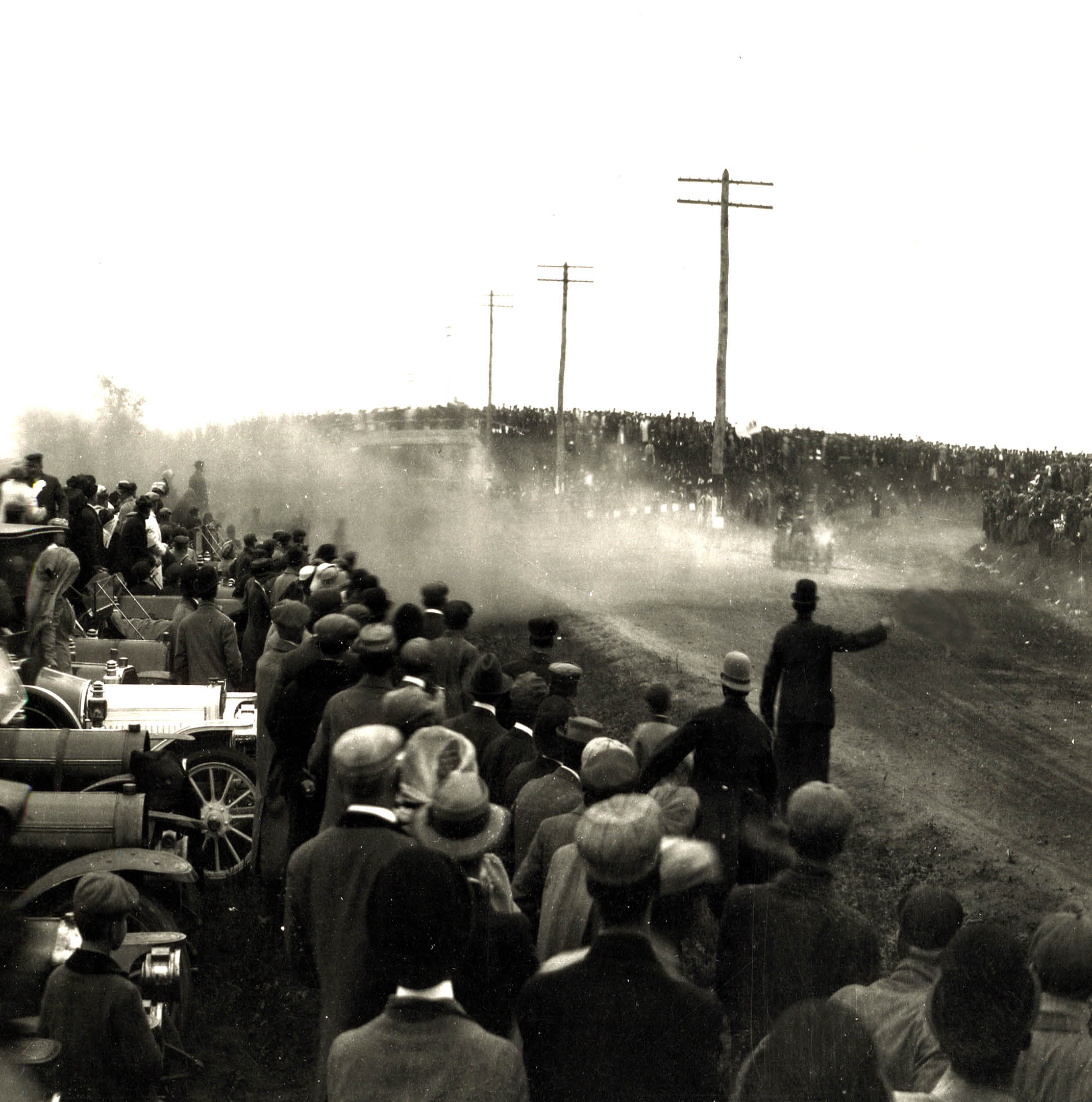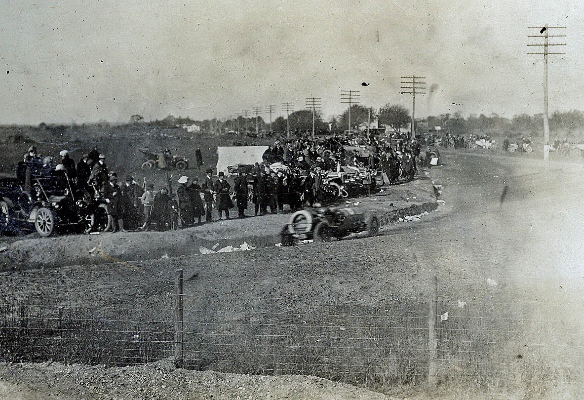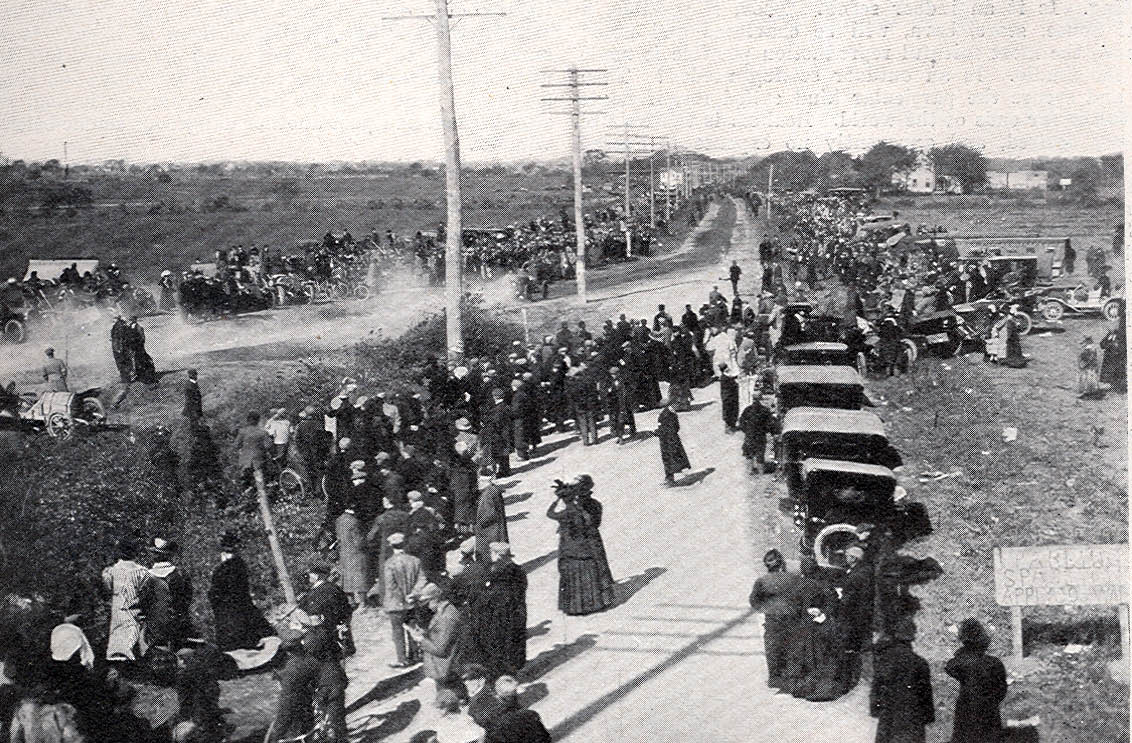 Looking south at the crowd on the Massapequa-Hicksville Motor Parkway Bridge and the turn. Over 2,000 spectators watched the race here.
