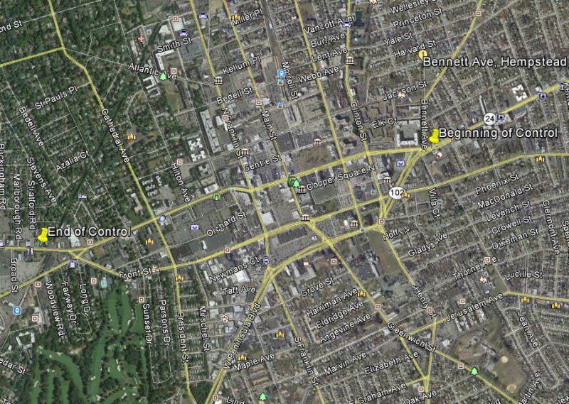 The beginning of the control was just east of Bennett Avenue. The end of the control was 1.40 mile west, just past the train tracks of the Hempstead Branch of the Long Island Rail Road.