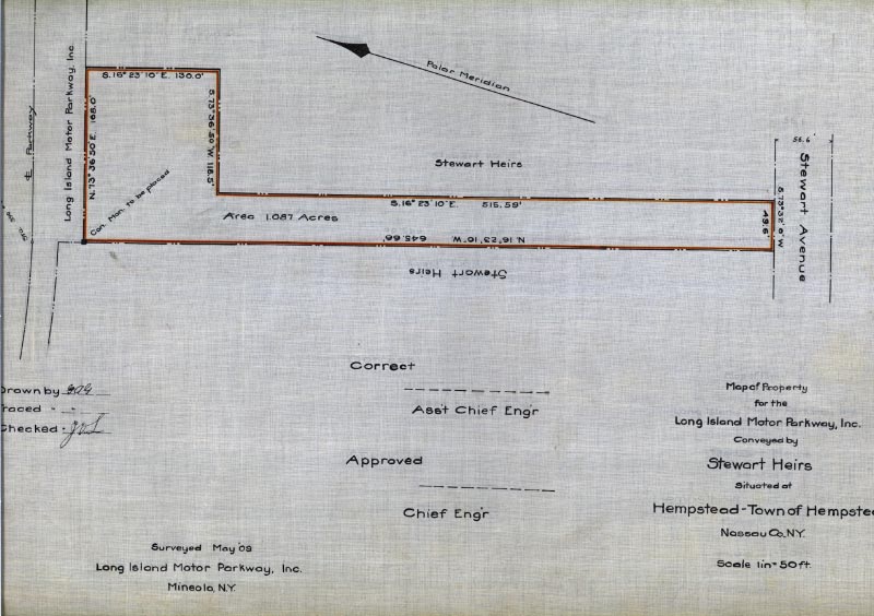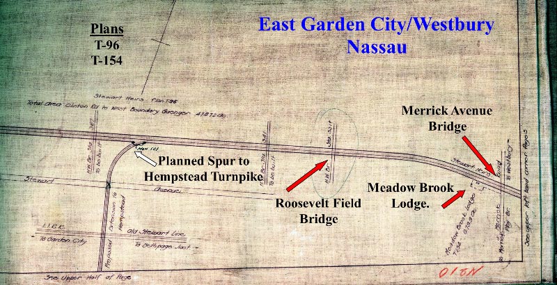 The section of the extension from the Motor Parkway to Stewart Avenue was purchased from the heirs of the A.T. Stewart. The rectangular section adjacent to the Parkway provided enough property for a possible "Hempstead Lodge."