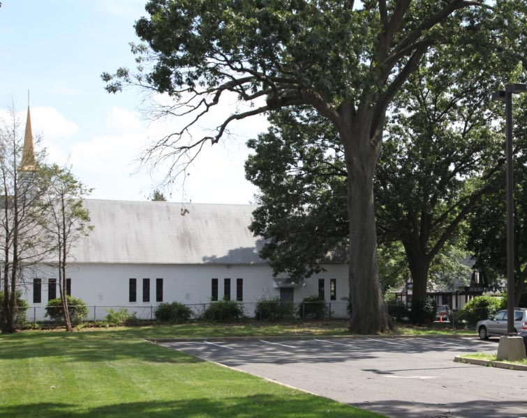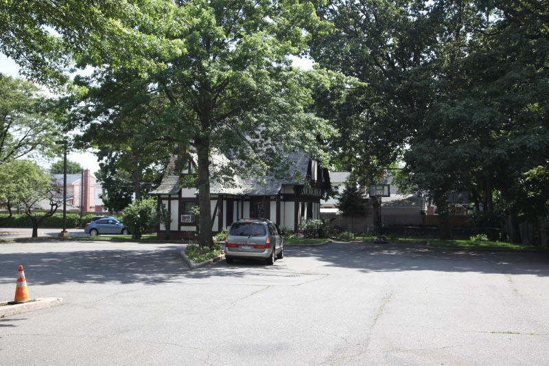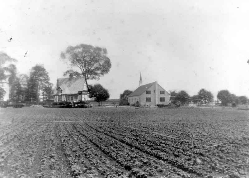 According to Village of Lake Success historian Dr. Jack Binder, the gate lodge was donated by the the Schumaker Family to Long Island Jewish Hospital in the early 1950s. In 1952, the St. Philip & St. James Church exchanged a small parcel of land to the Long Island Jewish Hospital for the gate lodge. The lodge, which would be used as a rectory, can be seen here being moved 375 feet south to its current location.