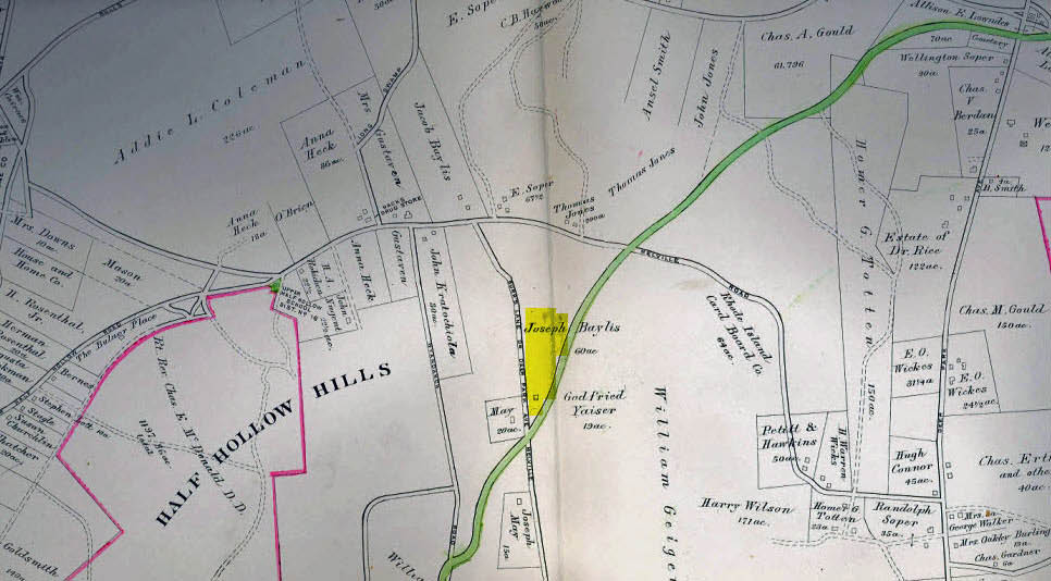 Five Towns College is located in the former property of Jacob Baylis in Half Hollow Hills and later the Burrs Lane Junior High School. As shown in this July 1907 survey by C.P. Darling, the Long Island Motor Parkway, Inc. purchased a 7.021 acre section of the property for the road's right-of-way.