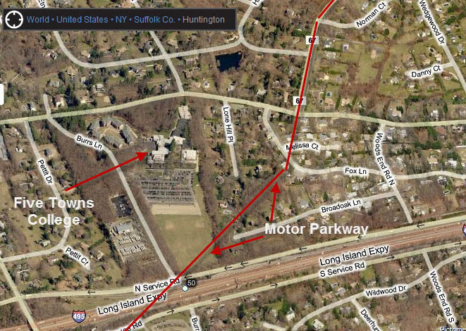 This Bing Map shows the location of the Motor Parkway through this section of Half Hollow Hills. The row of trees beyond the Five Towns College border, indicate that Motor Parkway remnants may still exist in the backyards of houses on Lone Hill Place, Broadoak Lane, and Fox Lane.