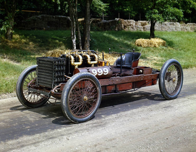 The 999 racer was an engineering feat for its time. Power came from an inline four-cylinder engine, displacing 1,155.3 cubic inches and developing somewhere in the neighborhood of 70-100 horsepower. The flywheel alone weighed 230 pounds and was connected to the rear axle through a wooden-block clutch and a solid driveshaft that mated to an unsealed and dry ring-and-pinion gear to transmit its power to the rear wheels.