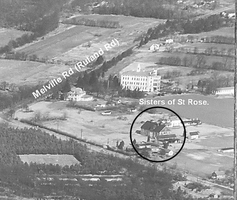 I certainly can identify our house, including the 1937 Buick Roadmaster (pocket limo) in the drive. In the foto, if you drop a vertical line from the second "s" in "Sisters" you will hit the southeast corner of our house -- my bedroom was on the second floor (our house appears much smaller than I recall). Just to the right of the Buick is our garage... and, moving up to the Sisters of St. Rose "Big House" from our garage, you first come to the old "Yellow Barn"; just east, the "Corn Crib" (Smoke House is not visible); the "New Barn"; the "Chicker Coops", with poultry man's quarters in the building in between. The "mansion" appearing on Ruland Road before the "Big House", was "St. Peter's", a guest house for visiting clergy and well-to-do benefactors. The first of the two houses further up Ruland Road belong to Jimmy and Theresa Ross, and the second to Theresa's mother -- both houser being built from scratch just a few years before. And, way up in the corner along Ruland Road, where it intersects with New HIghway, was the Noheil's farm.