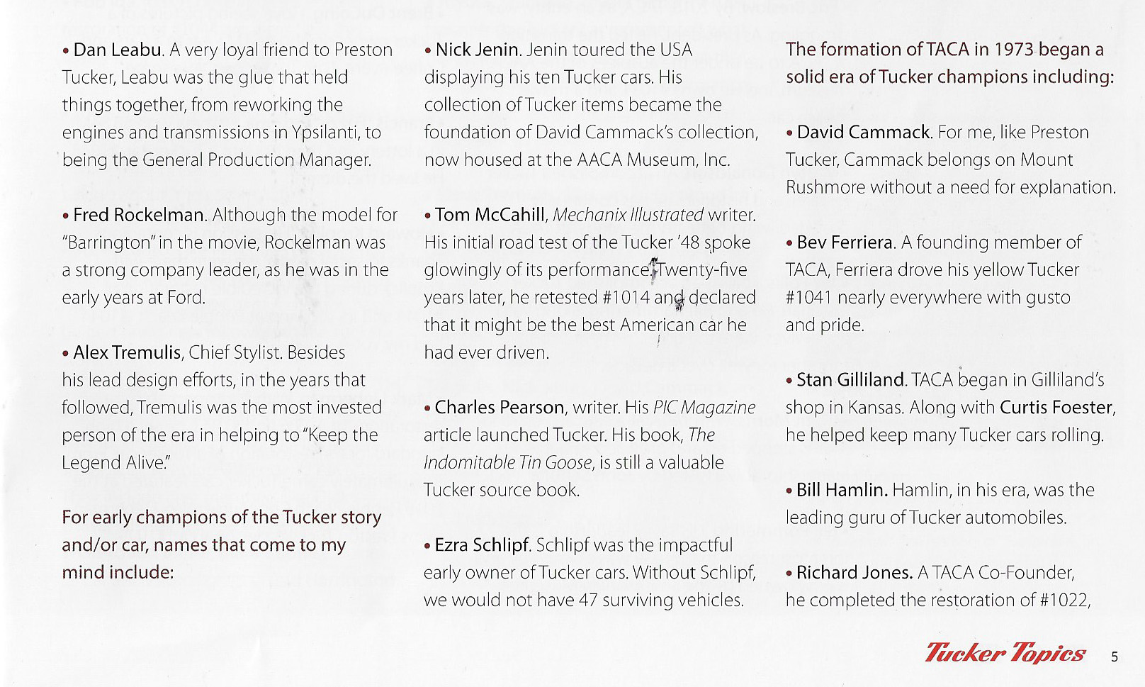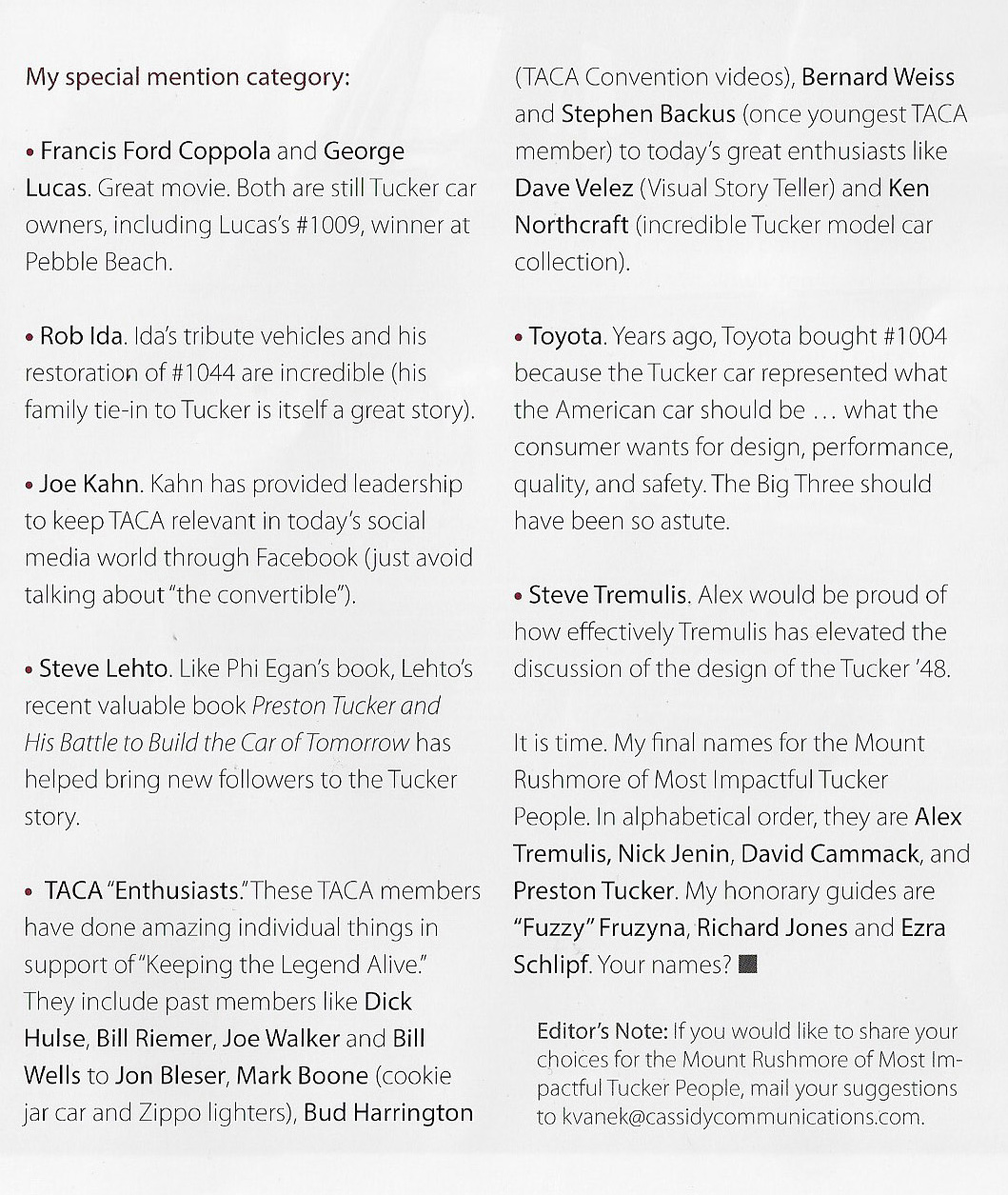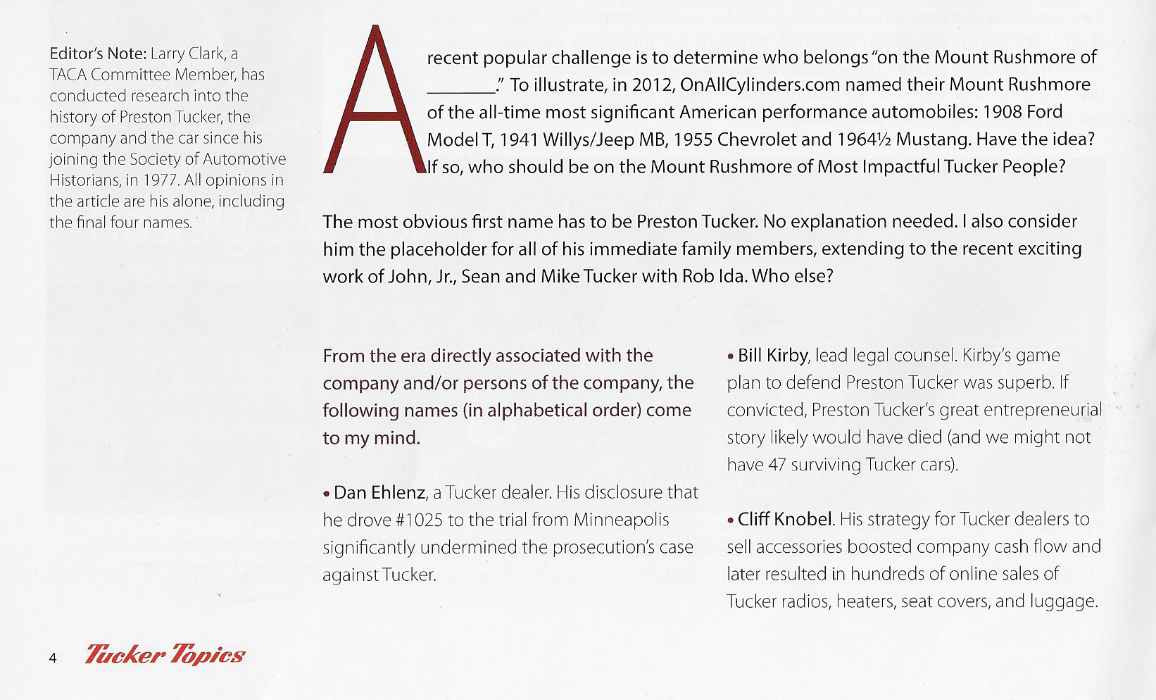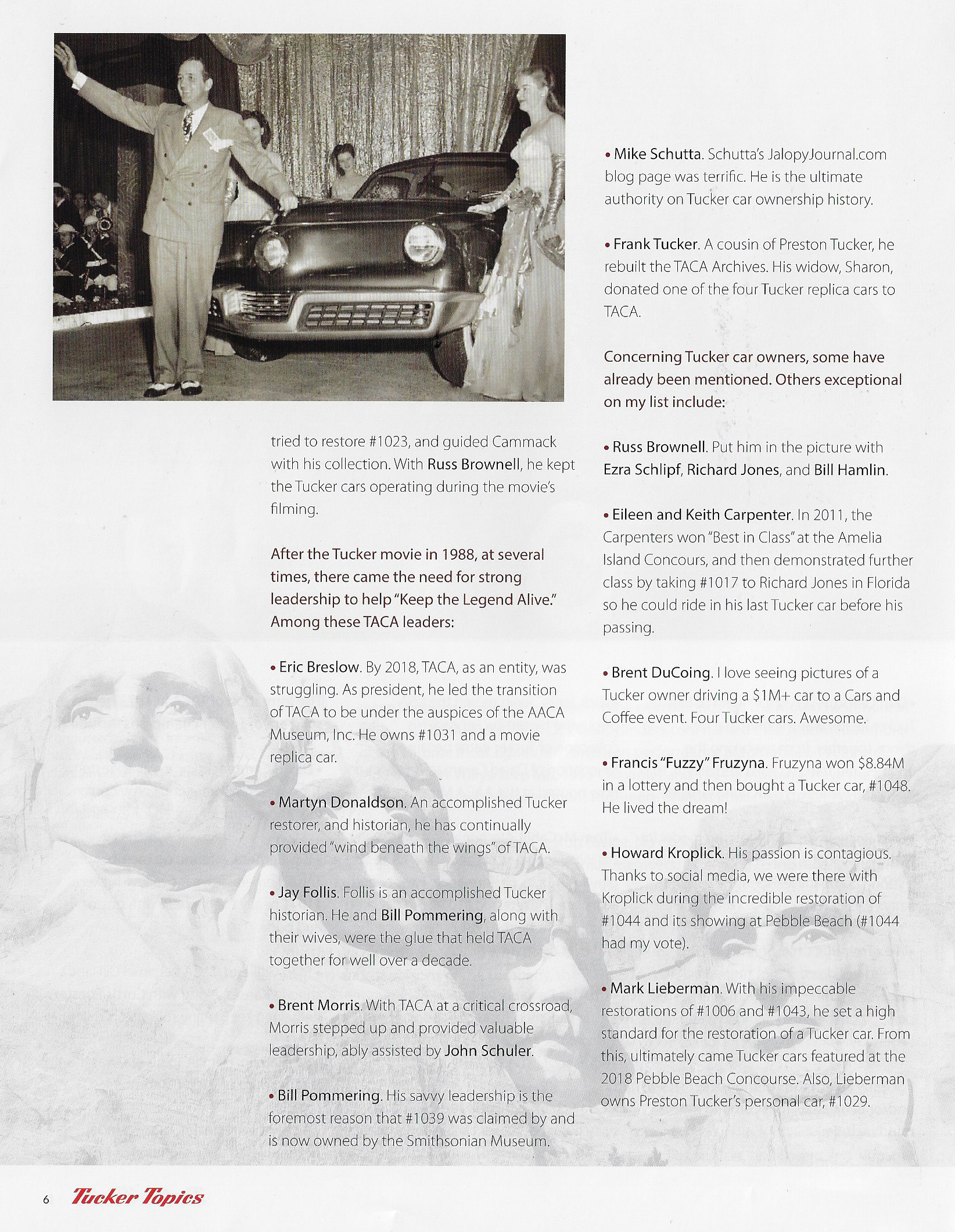 In the combined summer 2019 issue of Tucker Topics and the AACA Museum Reflections magazine, Larry Clark names the Mt. Rushmore of the 50 "Most Impactful People". It is an honor that the Tucker 1044 team of Rob Ida, Sean Tucker, Mike Tucker, John Tucker Jr. and me were named to the Tucker 50.