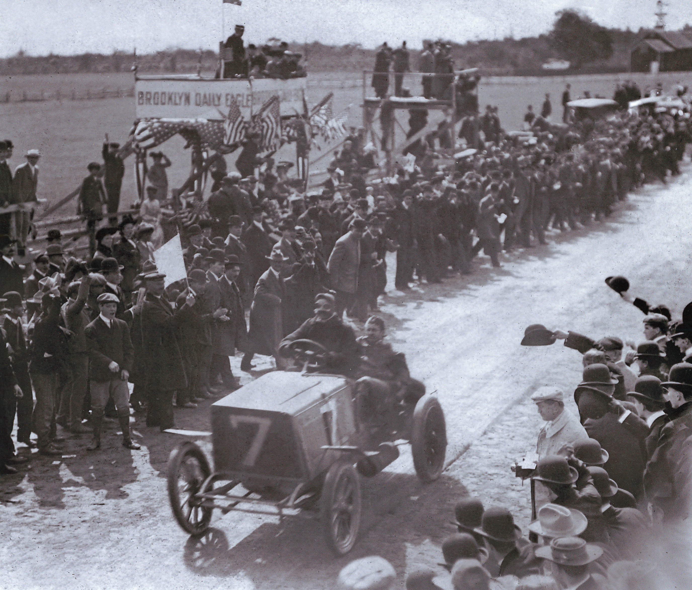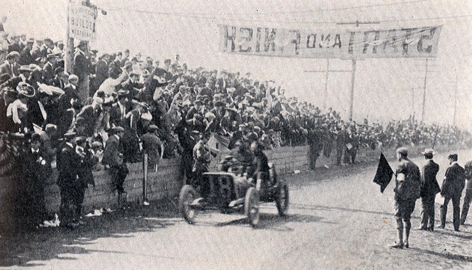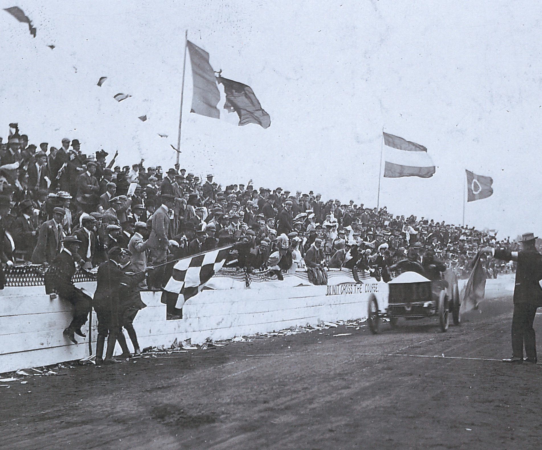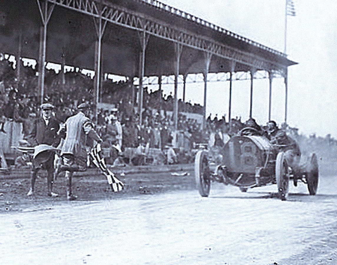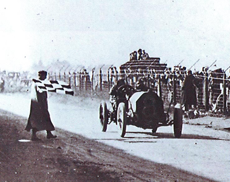 1904 Vanderbilt Cup Race: George Heath winning in a Panhard (France), averaging 52.2 mph. A white flag signified the end of the final lap.