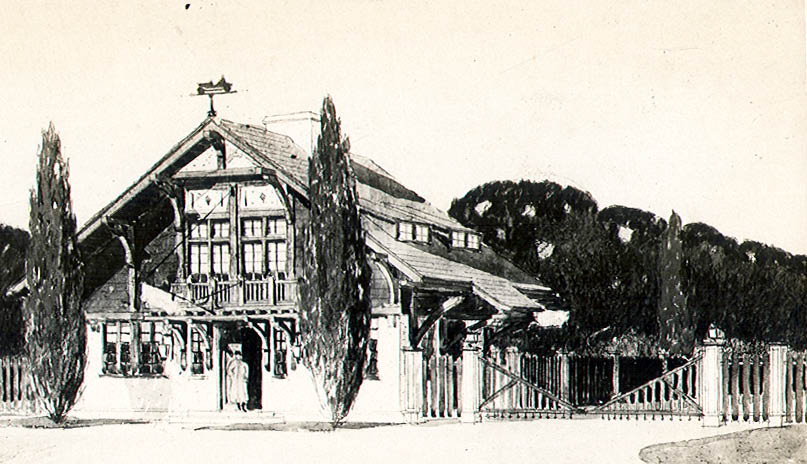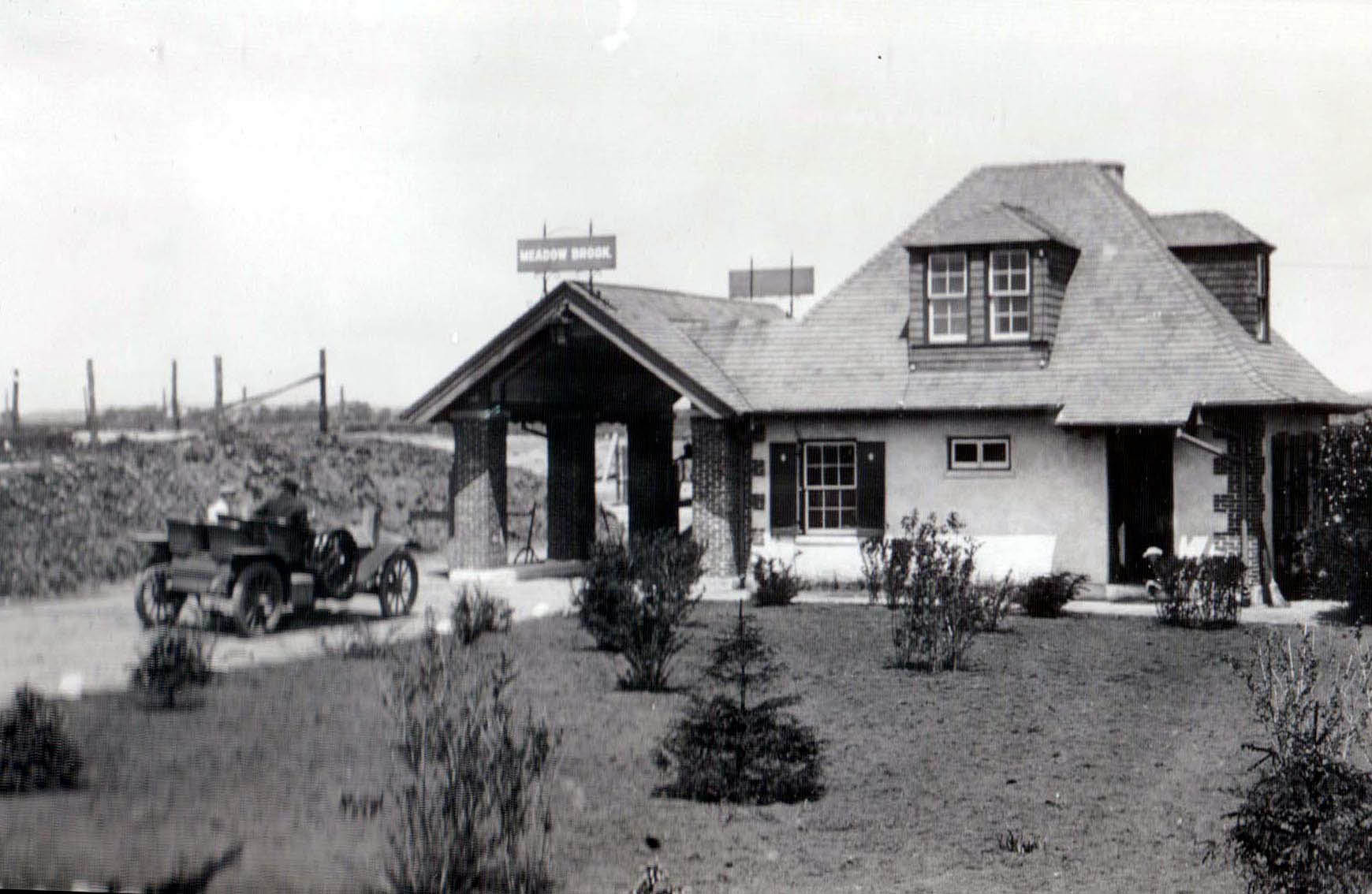 As described in Al Velocci's book The Toll Lodges of the Long Island Motor Parkway, and Their Gatekeepers' Lives, the inn concept was soon dropped due to costs and concerns about antagonizing hotel owners and automobile service companies along the Motor Parkway route. Russell replaced the inn concept with the smaller lodge design as shown here in the Meadow Brook Lodge. Russell designed the first six Motor Parkway lodges which all had small living spaces for the lodgekeeper's families and some of the design features from his original inn plans.