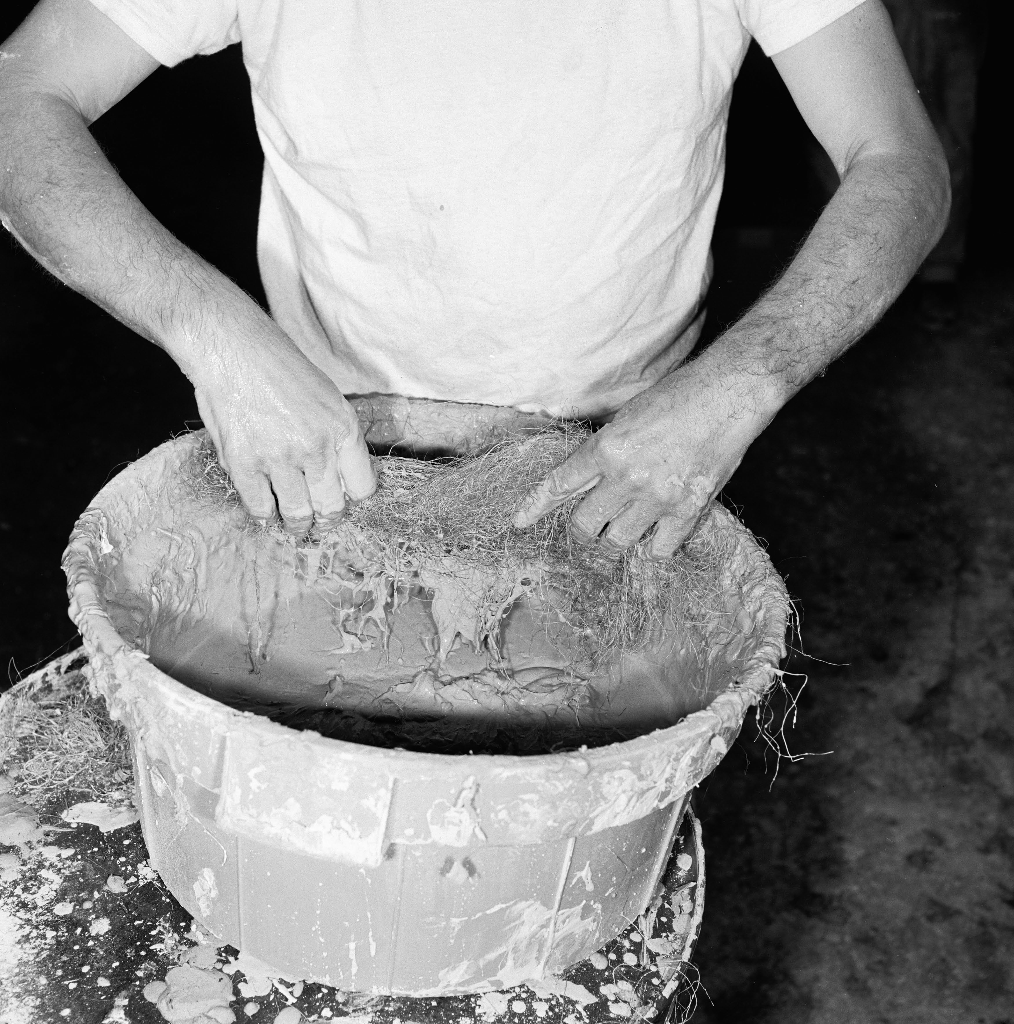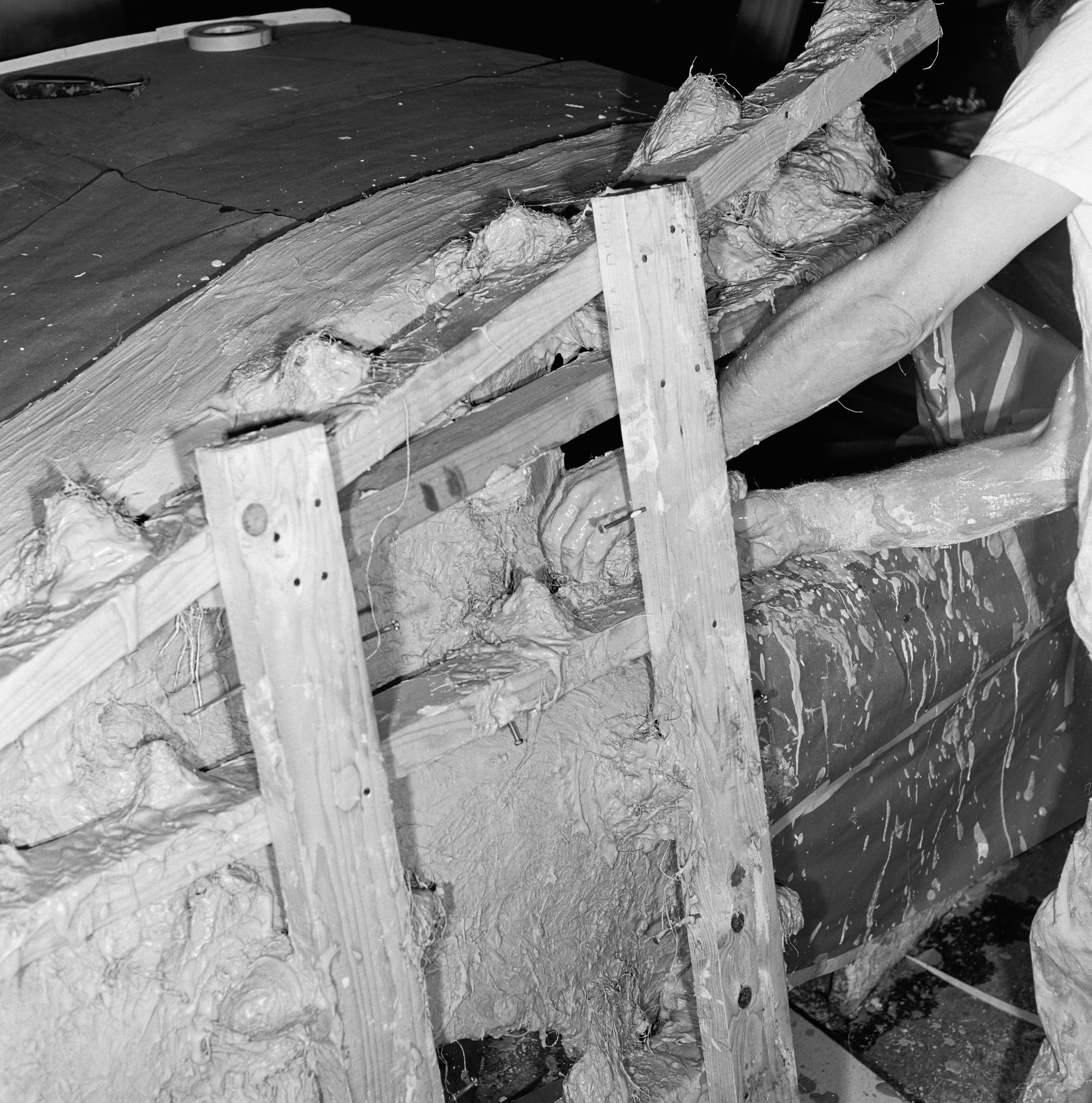 That’s Vince Gardner working the molds. Here he is working on a rear spoiler for a Mustang project with Alex Tremulis. Together they also built the body for the Gyronaut X-1 motorcycle streamliner, the World’s Fastest Motorcycle from 1966 to 1970. Looking forward to more shots of the Mustang III being built!
