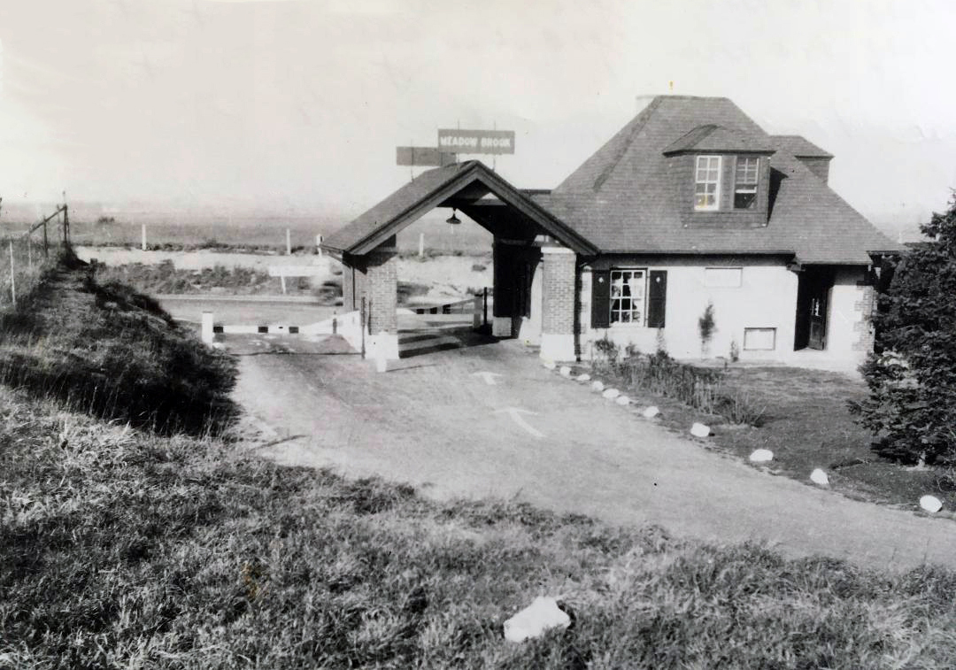 The operational Meadow Brook Lodge in the early 1930s. Note the arrows before the gates and an automobile on the Parkway.