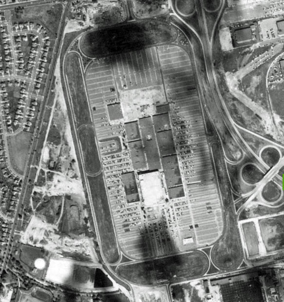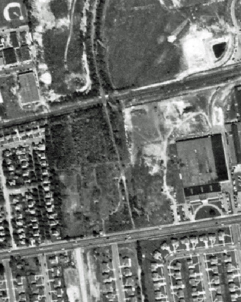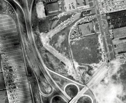 Remnants of the two Roosevelt Field concrete runways were still visible east of Meadowbrook State Parkway. The absence of traffic on the parkway confirms that this section had not yet opened.