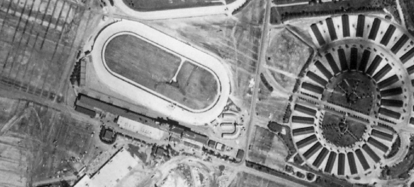 The active Roosevelt Raceway seen here was used for harness racing. It used the same grandstands that were built for the 1936 and 1937 Vanderbilt Cup Races.