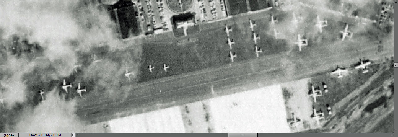 This is the area I covered by helicopter in 1959 on my LIMP Central Nassau page, http://sbiii.com/limpcnas.html#roosvfld . Immediately following that is an aerial analysis of the area in 1938 using an earlier one of your pix, http://sbiii.com/limpcnas.html#rfld1938 . As to the warplanes on the tarmac, it’s hard to distinguish the smaller ones (possibly North American T-6 Texans) but there are a bunch of unmistakable twin-engined Curtiss C-47/53s (DC-3s) at the far left, with a few at right, a slew of twin-boom Fairchild C-119 Flying Boxcars at far right, and seven twin-engined North American B-25 Mitchell medium bombers at right center. What I’d hoped to see were the twin-fuselage P-82/F-82 Twin Mustangs. Mitchells (two “L"s) and Twin Mustangs (no “L”) were a feature of Mitchel (one “L”) for me. What the “L”! Sam, III