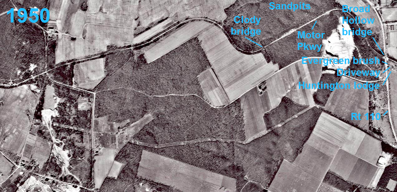 Frank: Fantastic find of the Huntington Lodge! While I'm continuing to search for a 1938 aerial of the lodge, I came across two of your pics, 1930 and 1950 aerials of the Melville area. In the 1950, I circled just south of the LIMP what appears to be Maureen's home (lodge), driveway, and evergreen brush that she mentioned along the north side of the driveway (photo with the large truck and driveway). Could this be lodge? In the 1930, this area was clear.