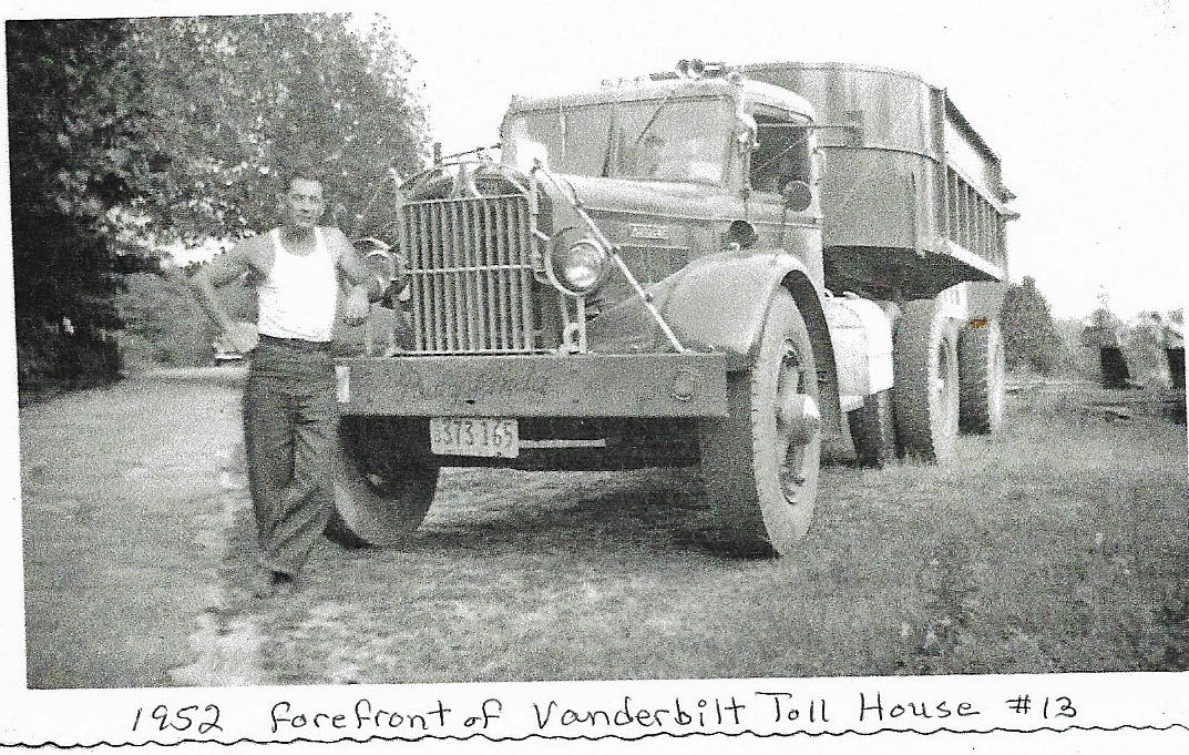 At one time my dad worked for William Durkin trucking and many of the trucks were parked each night. In our front yard because they were hauling the sand from across route 110 to another location. One very stormy night all the truck batteries were taken from the trucks and the police were called. This made the news but don't know what newspaper that would be. This truck is like the ones broken into during the robbery of the batteries. This is the forefront of the property right along route 110. To the left of the truck is the driveway which was made of the same material as the parkway road. The driveway ended just beyond the vehicle parked in the background of the picture.