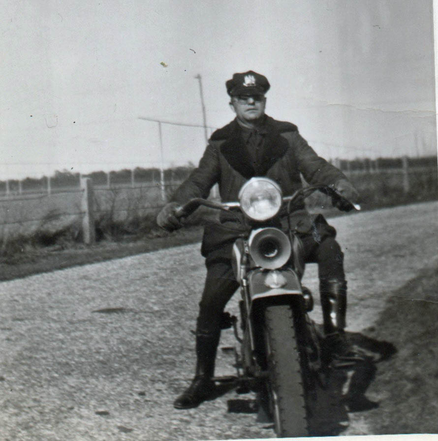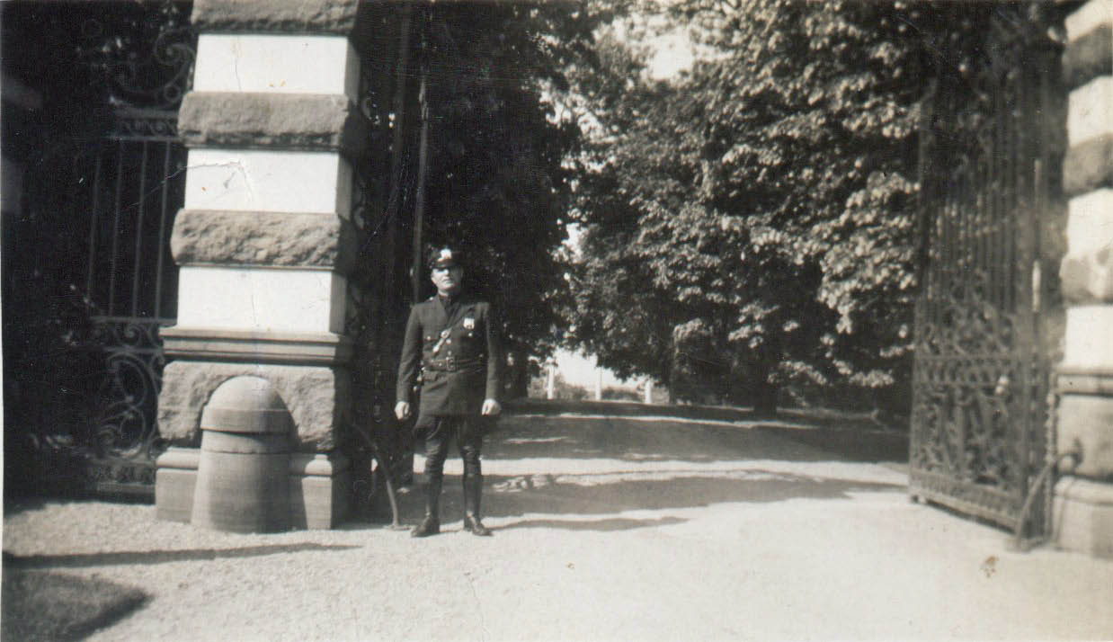 After the Motor Parkway closed, Thomas Zinzi continued to worked for William K. Vanderbilt Jr as his personal security guard. Here Zinzi can be seen at the entrance to Willie K's Eagle Nest estate in Centerport.