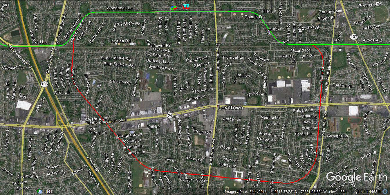 As seen in today's Levittown, the proposed course crossed the LIRR and Hempstead Turnpike twice. Courtesy of Frank Femenias.