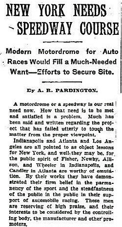 A.R. Pardington, general manager and second vice-president of the Motor Parkway, wrote this article describing the need for a "Modern Motodrome for Auto Races."
