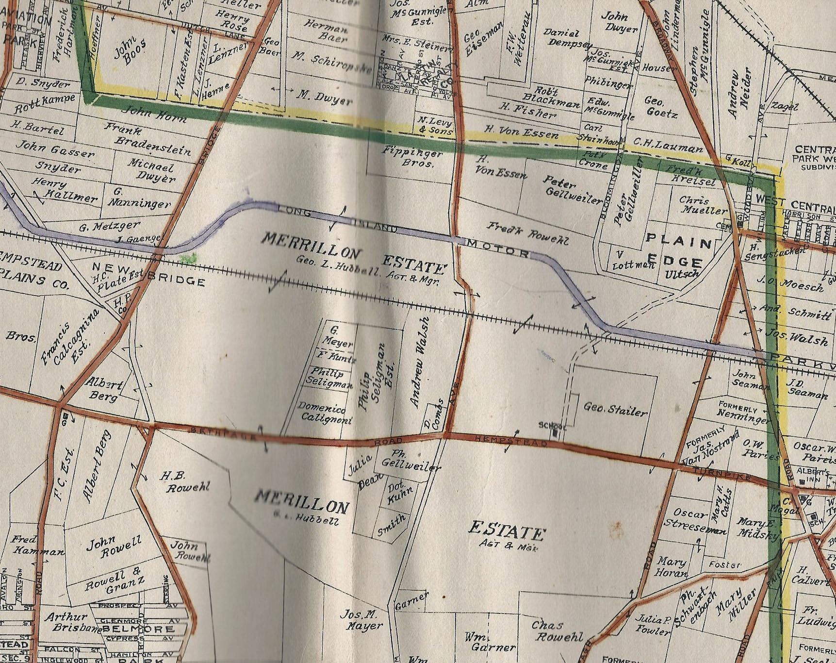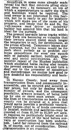 In early 1909, the Long Island Motor Parkway, Inc. examined options in the Hempstead Plains to develop a speedway focusing on properties owned by the Merrillon Estate who were the heirs to entrepreneur Alexander T. Stewart.