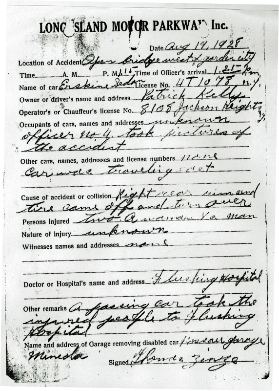 Zinzi wrote this 1928 traffic accident report at the "Mayan Ruins" bridge in Garden City.