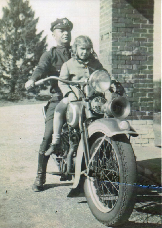 Thomas Zinzi on his Motor Parkway motorcycle with one of his daughters. Note: The huge siren in front. The photo was taken in front of the Zinzi's Massapequa Lodge home.