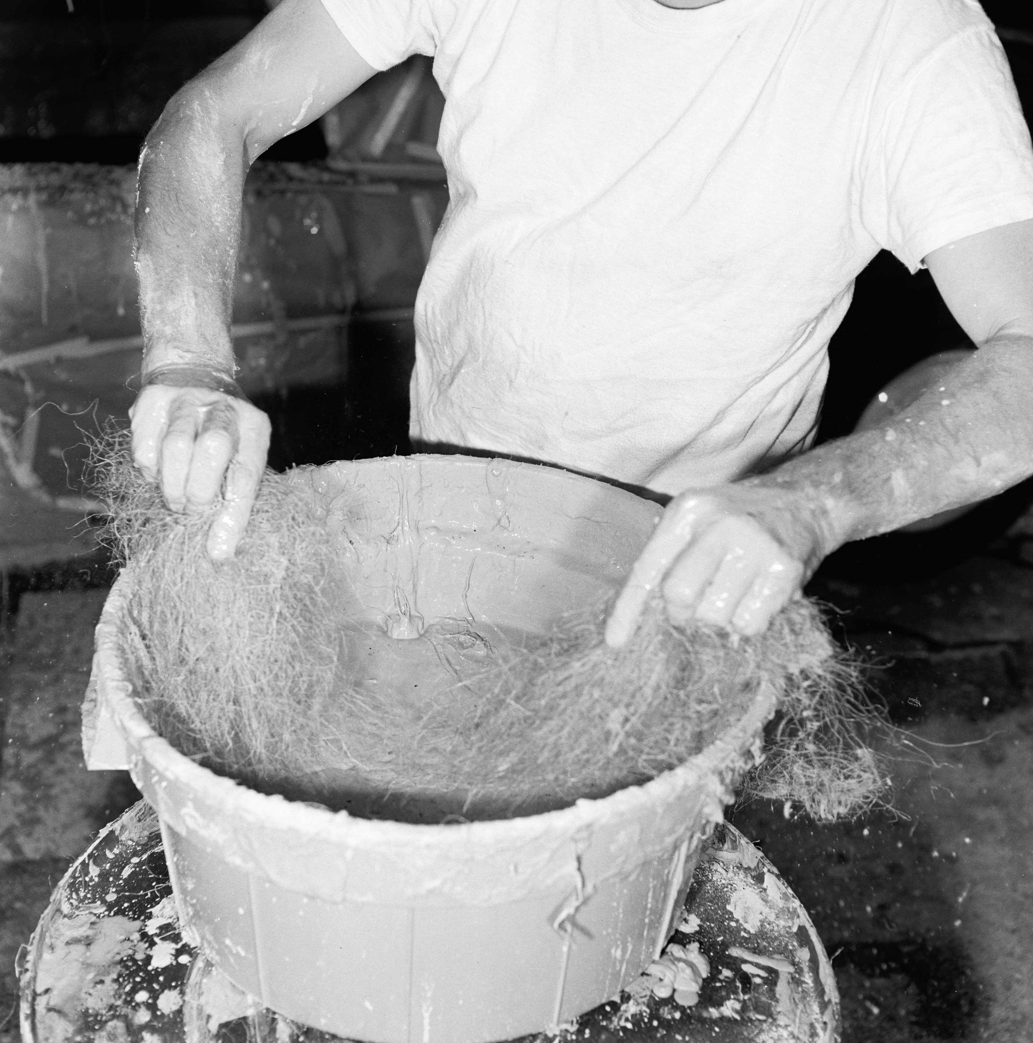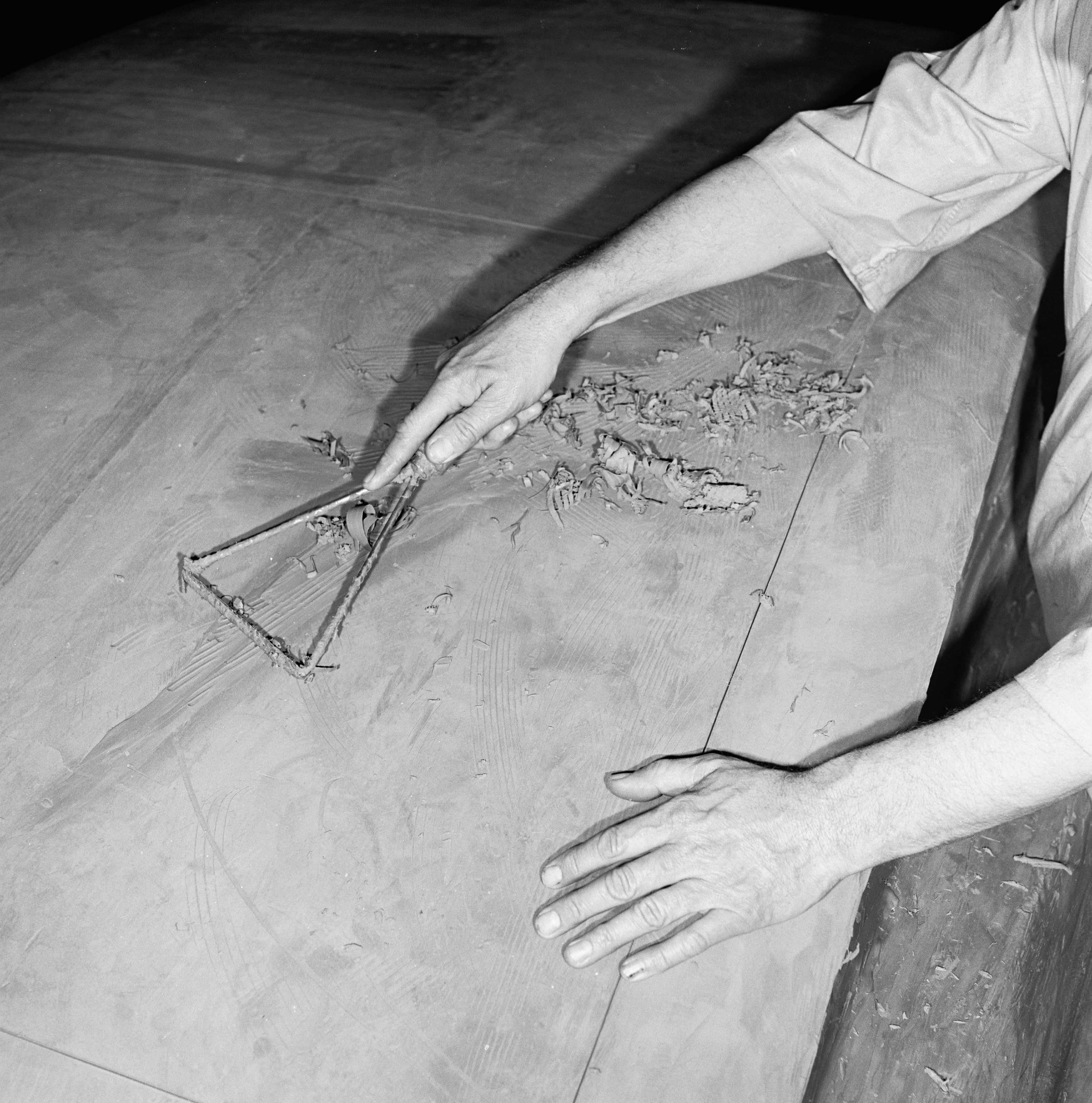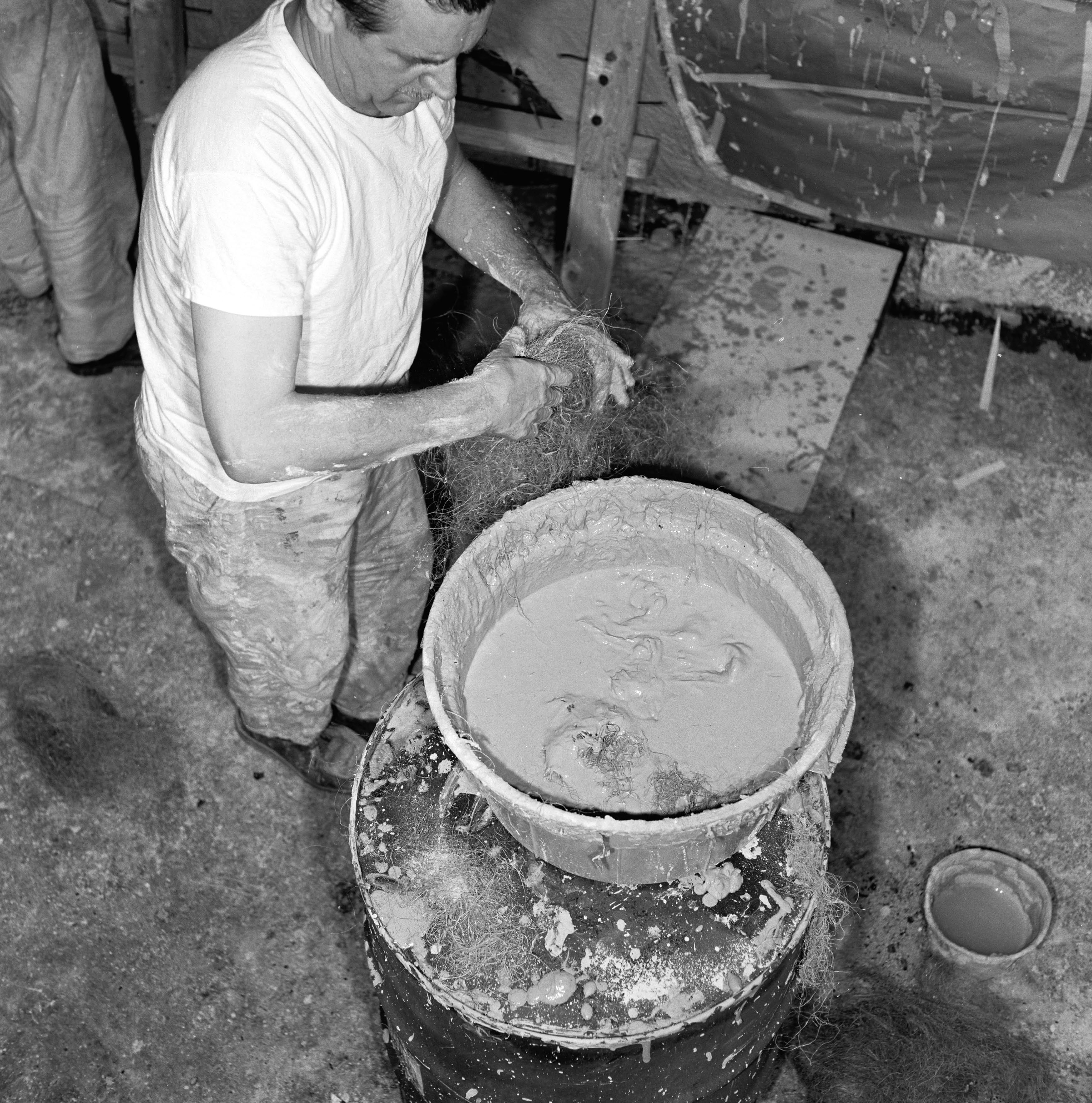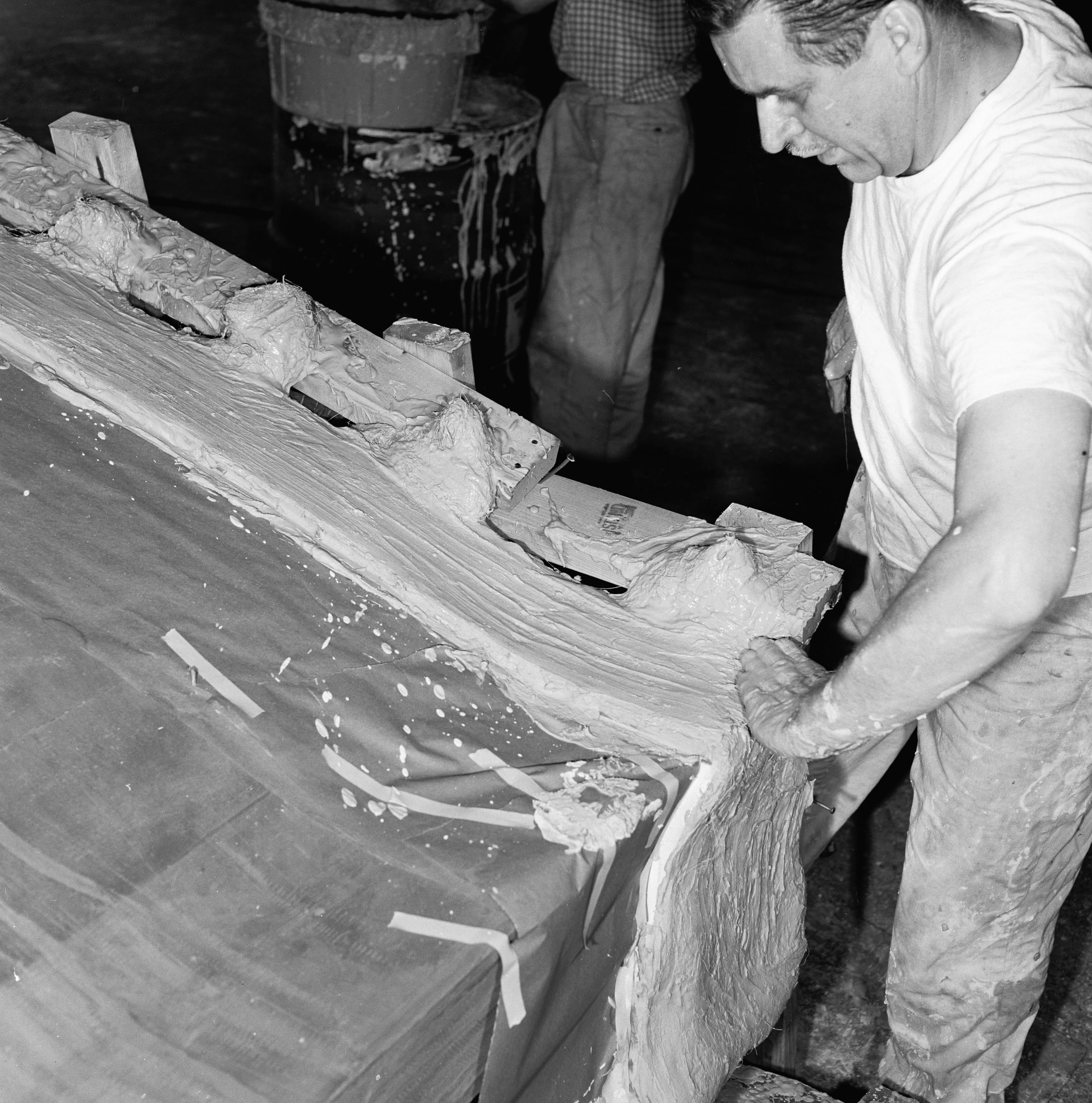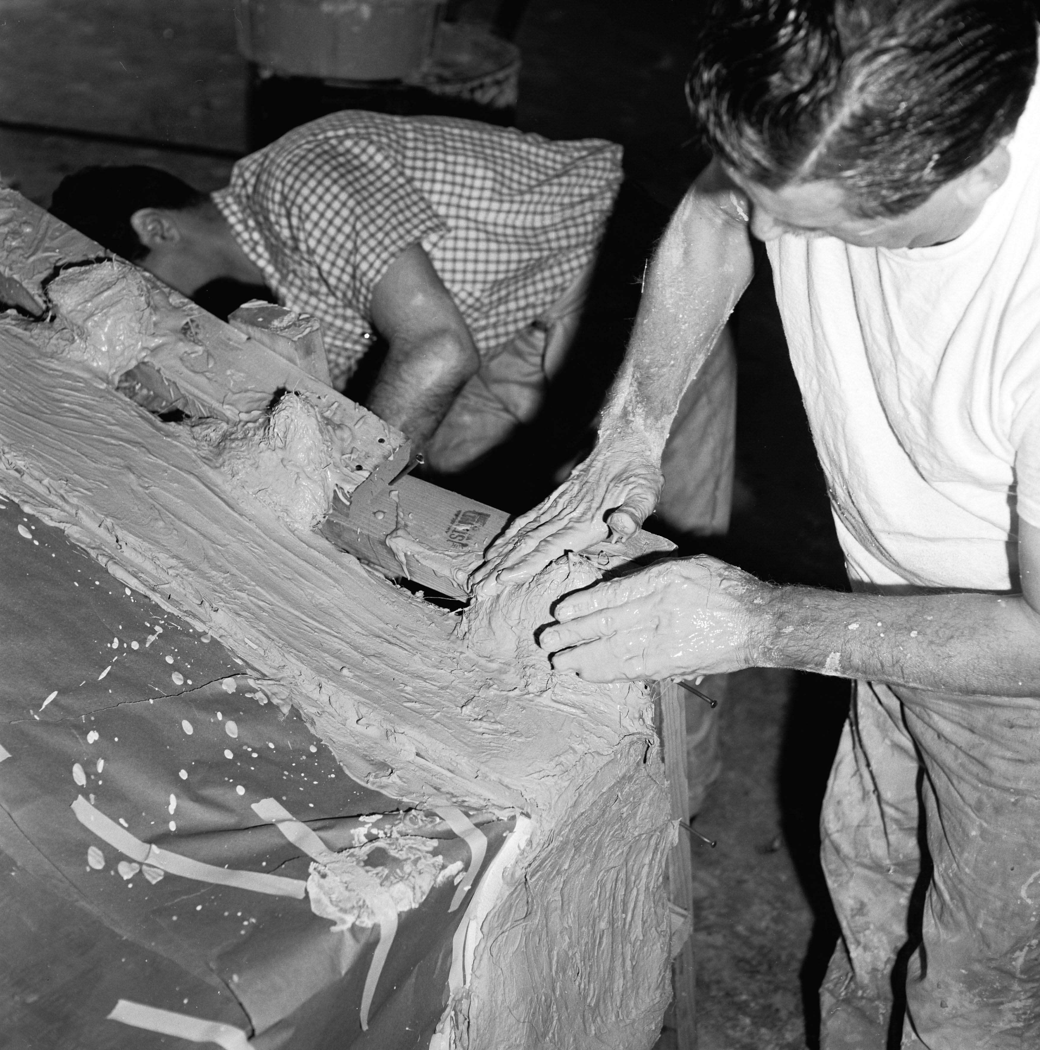 Caption: A mold must be built in sections, so that it can easily be removed. Here cardboard and clay fences are built up as the stop for the side molds.